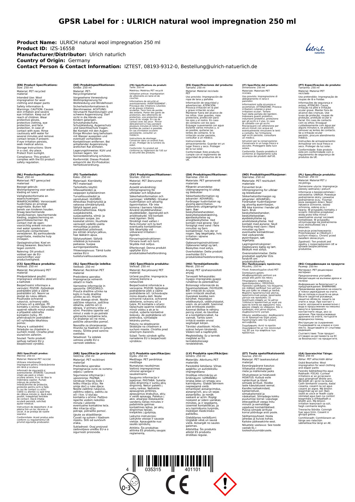 Stellen Sie eine Frage, um mehr über das Produkt zu erfahrenUlrich natürlich Wollimprägnierung 250 ml flüssig