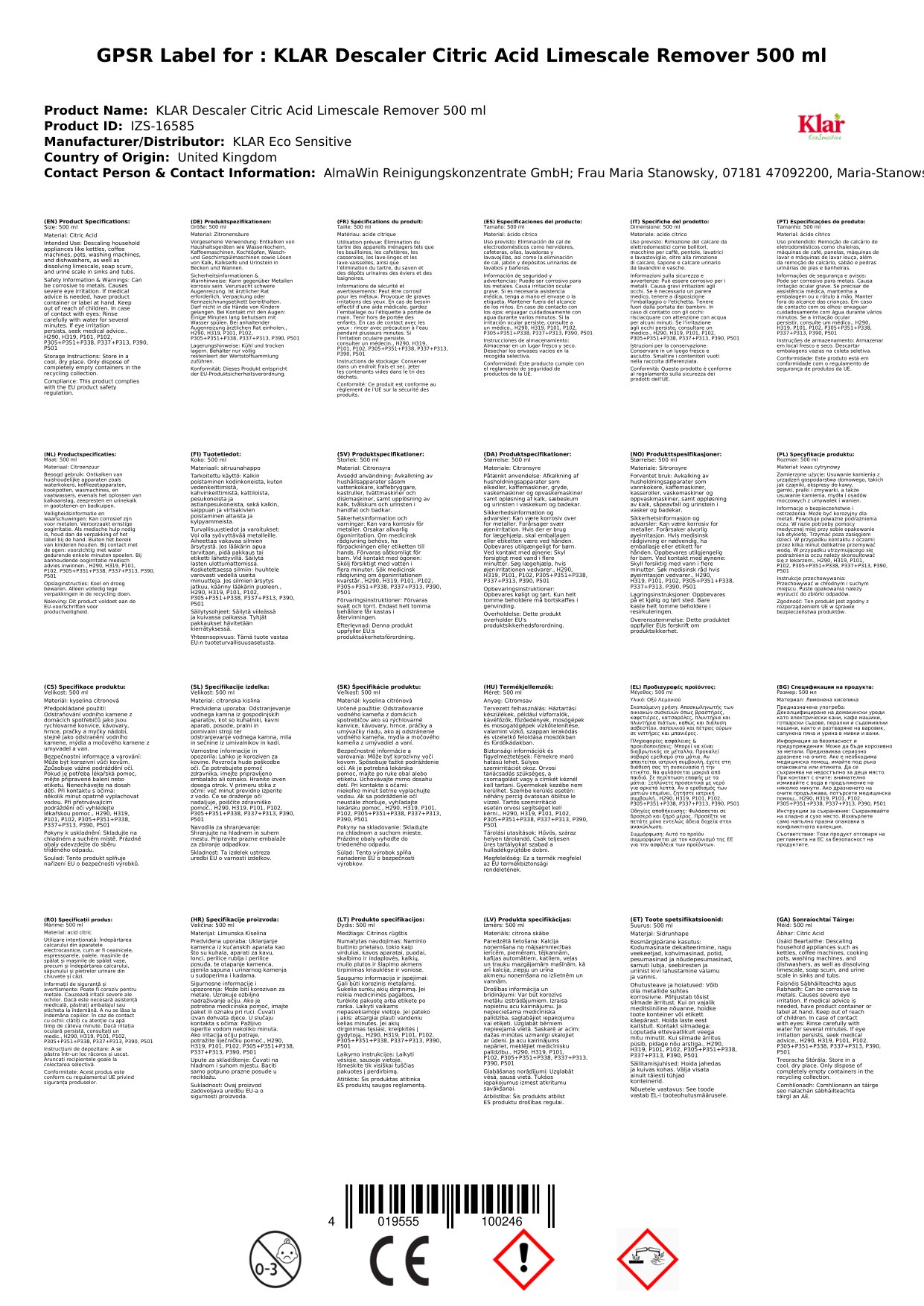 KLAR Entkalker Zitronensäure Kalklöser 500 ml