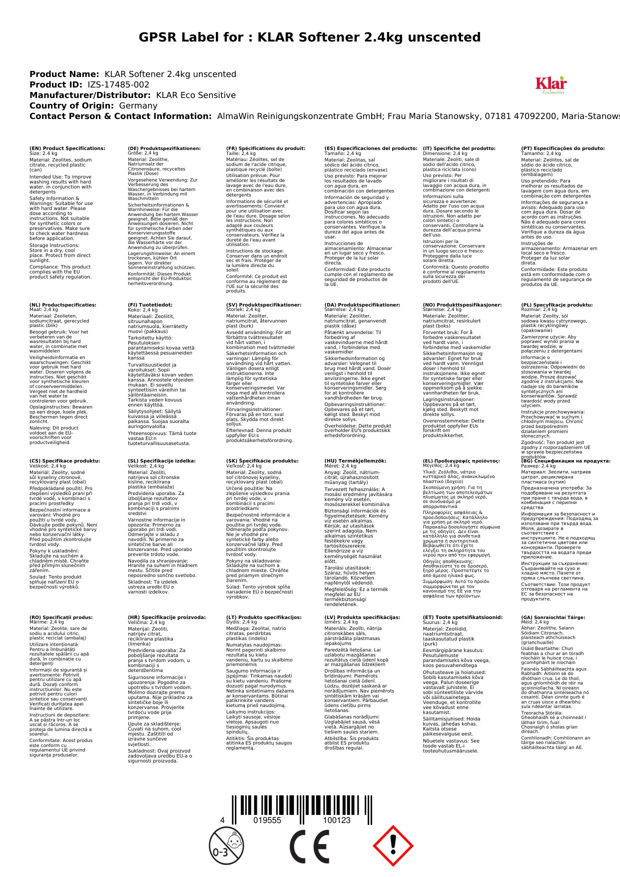 >=30 % Zeolithe. Weitere Inhaltsstoffe: Natriumsalz der Citronensäure. 100 % der Inhaltsstoffe sind natürlichen Ursprungs.
