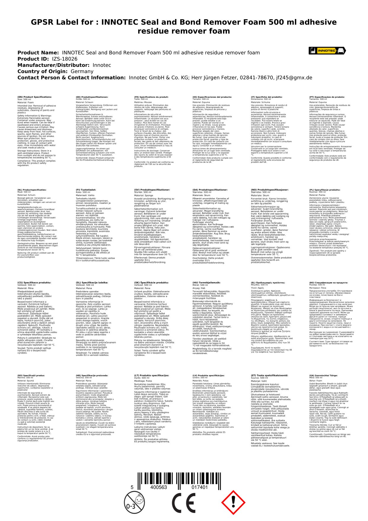 Stellen Sie eine Frage, um mehr über das Produkt zu erfahrenInnotec Seal and Bond Remover Foam Kleberesteentferner 500 ml