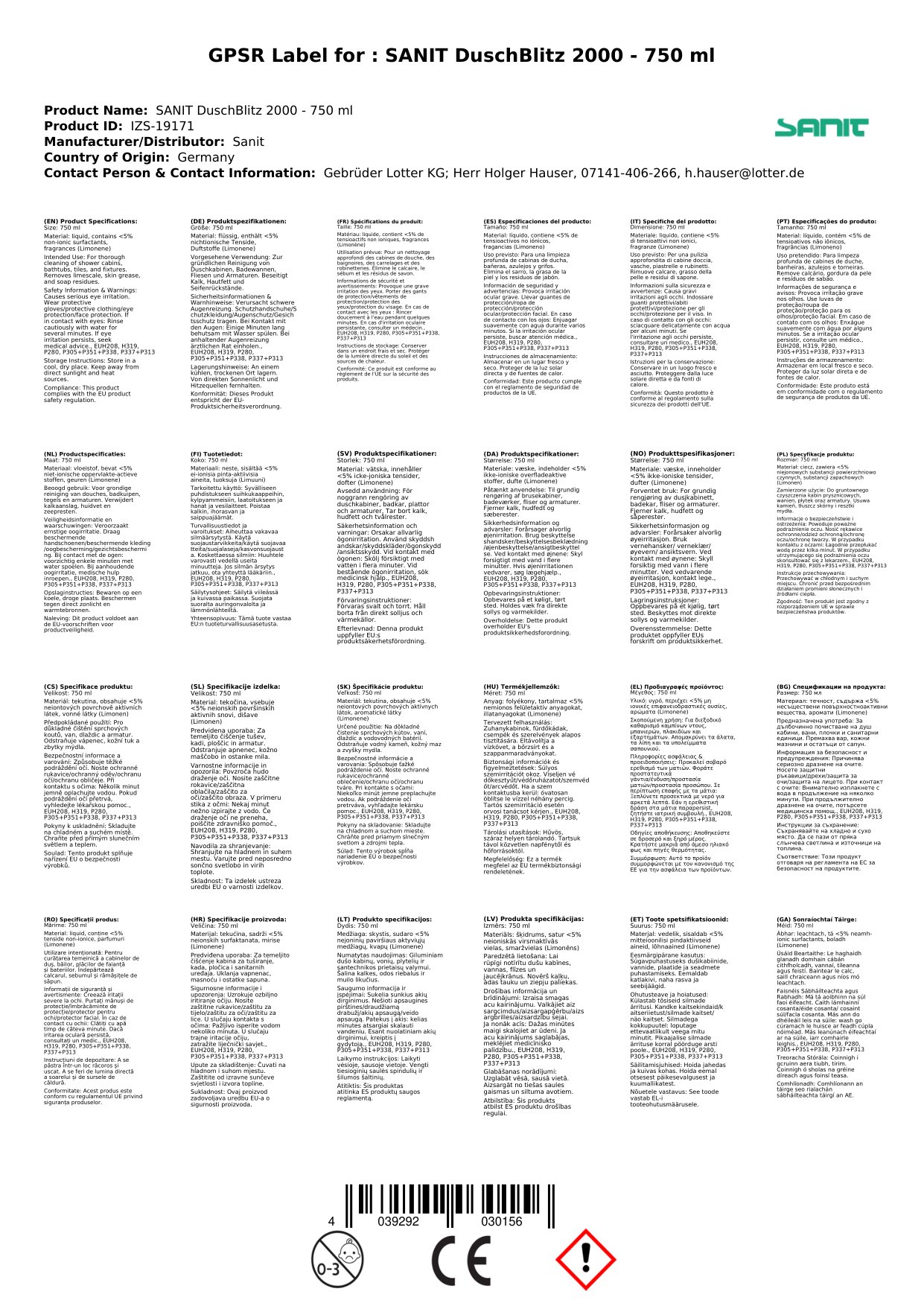 Stellen Sie eine Frage, um mehr über das Produkt zu erfahrenSANIT DuschBlitz 2000 Der Reiniger mit Kalklösekraft 750 ml