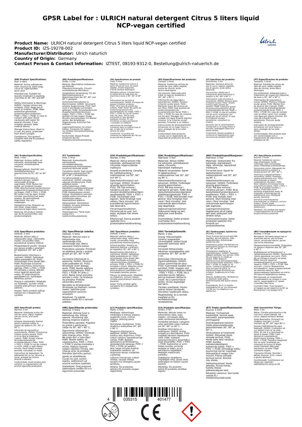 Stellen Sie eine Frage, um mehr über das Produkt zu erfahrenULRICH natürlich Waschmittel mit Citrus 5 Liter