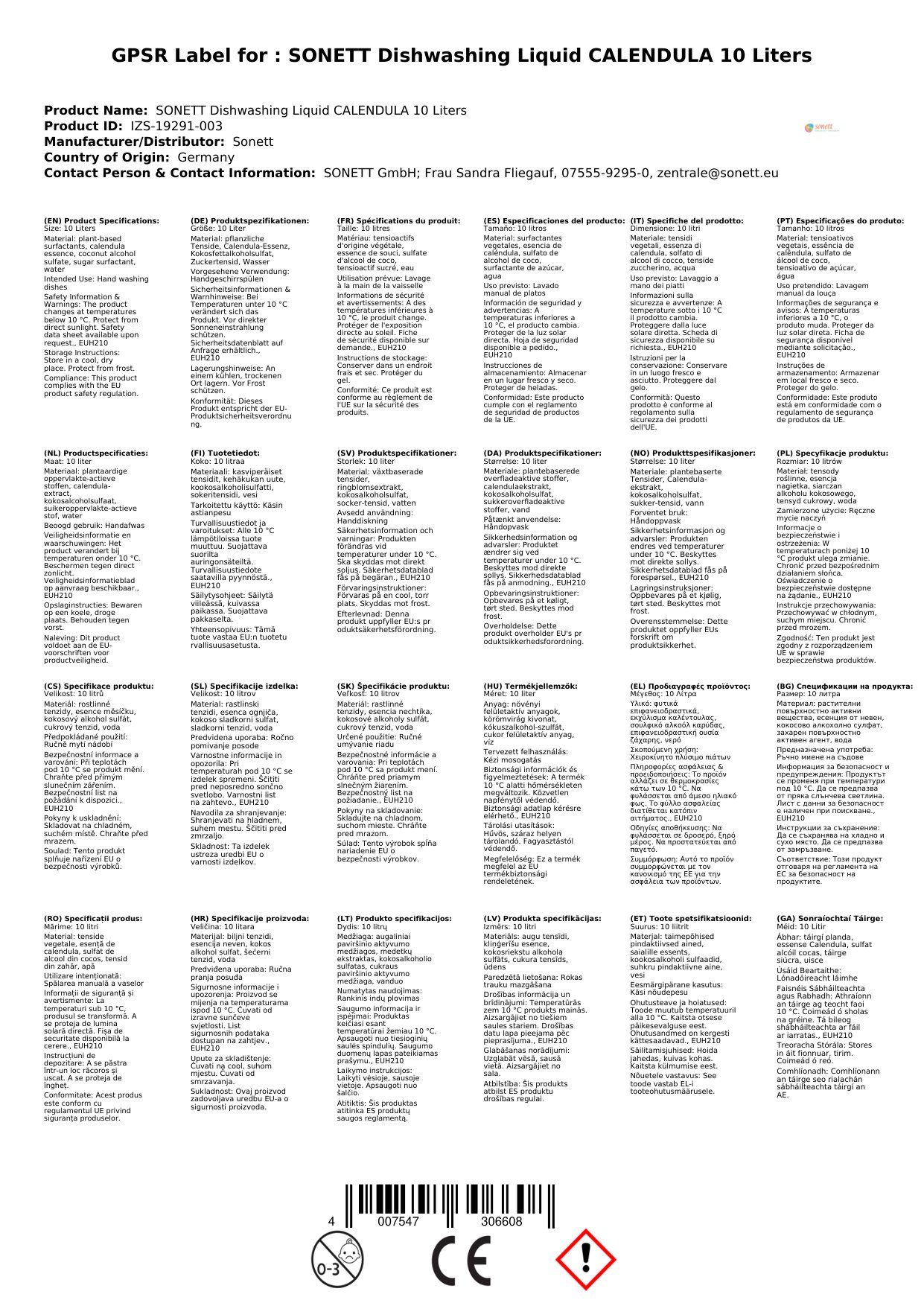 SONETT Geschirrspülmittel CALENDULA 10 Liter