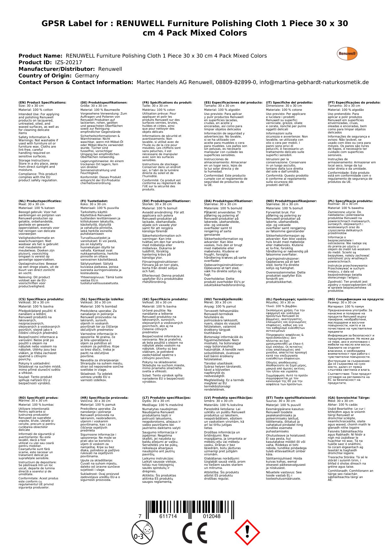 Das Renuwell Möbel-Poliertuch ist bis zu 60°C waschbar, wenn es mit Möbel-Regenerator, Möbel-Schnellpflege oder Swiss-Reiniger verwendet wurde.