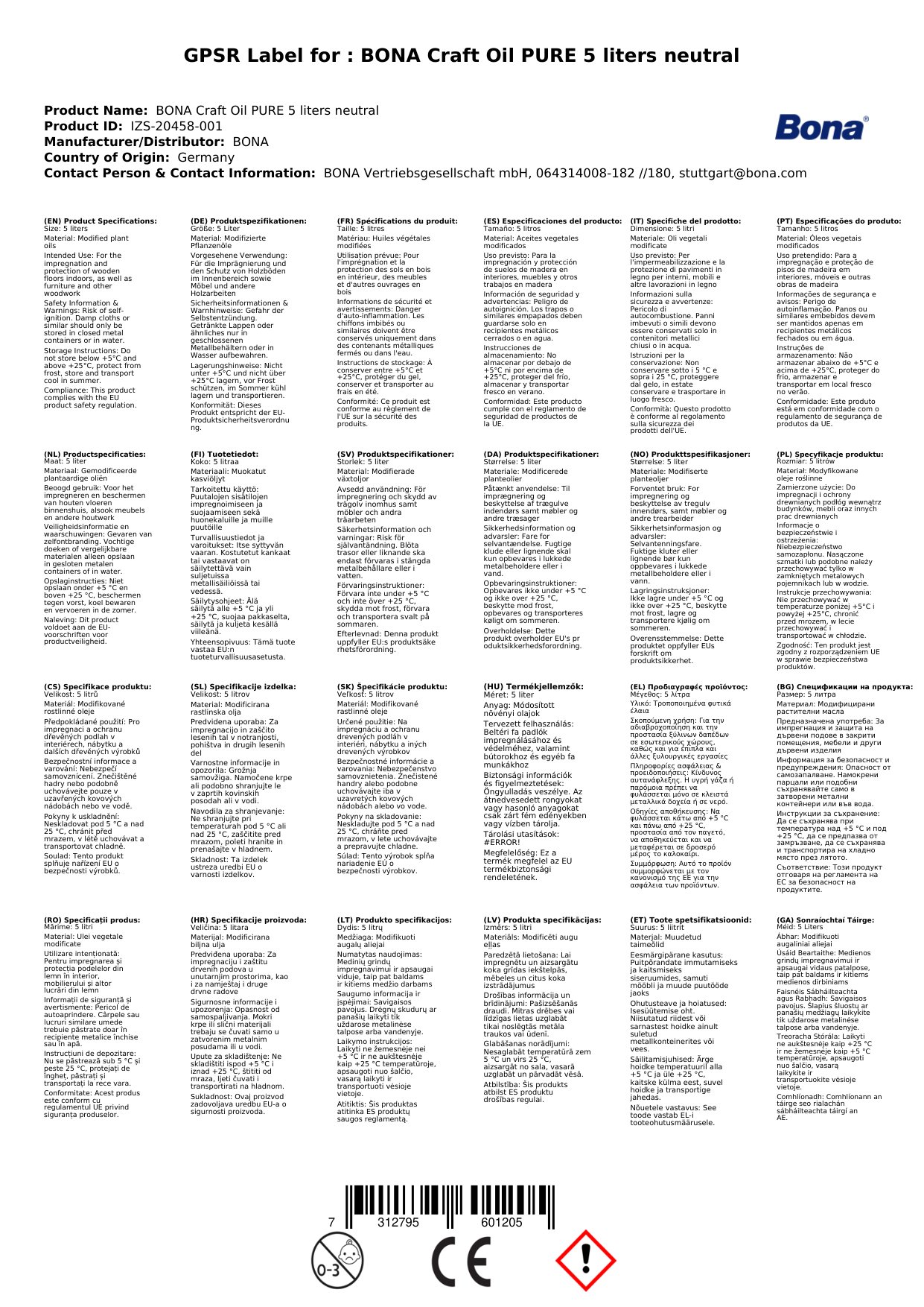 Bona CRAFT OIL 2 K OIL ENTHÄLT TROCKNENDE ÖLE. GEFAHR DER SELBSTENTZÜNDUNG. GETRÄNKTE LAPPEN ODER ÄHNLICHES NUR IN GESCHLOSSENEN METALLBEHÄLTERN ODER IN WASSER AUFBEWAHREN