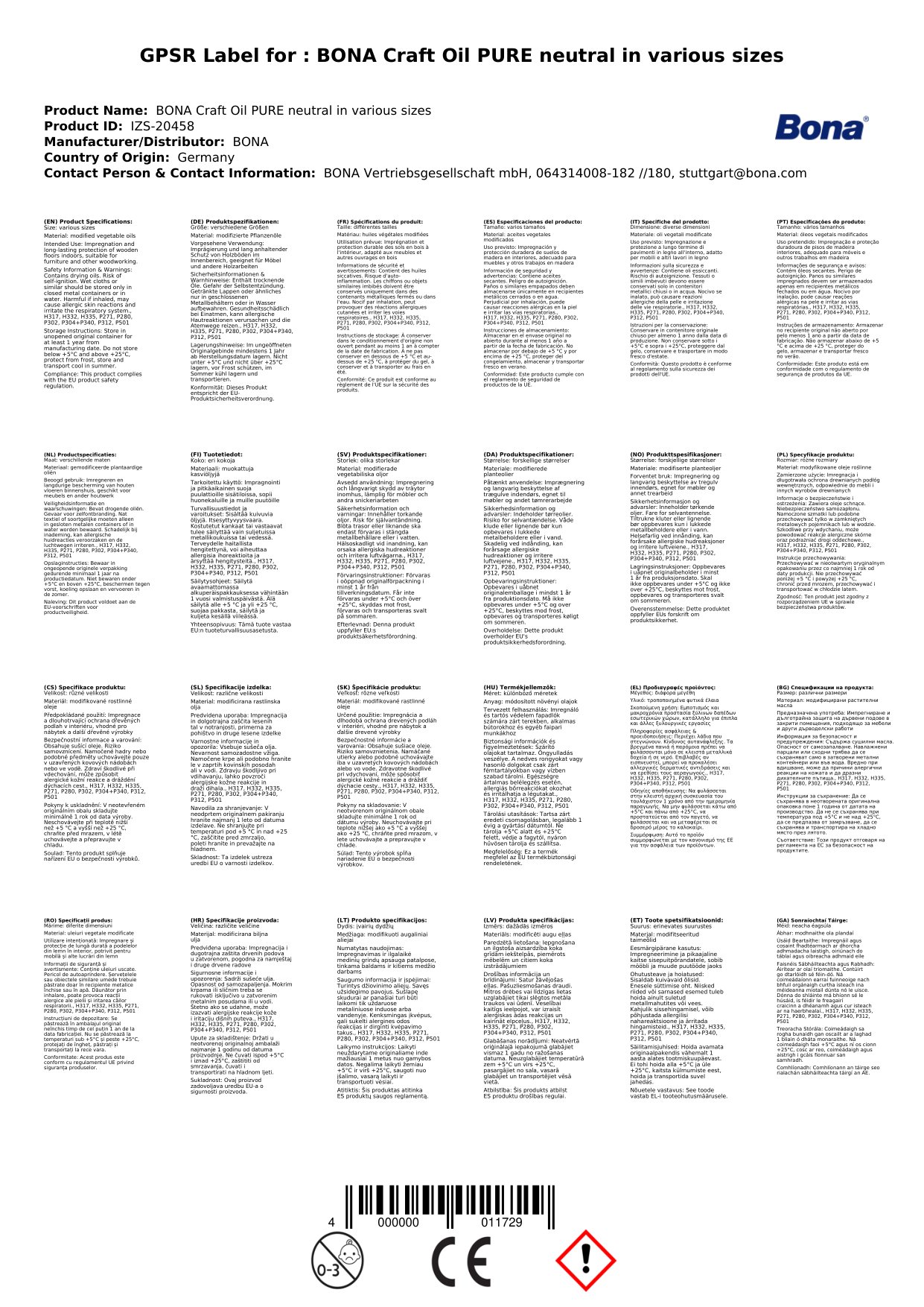 Bona CRAFT OIL 2 K OIL ENTHÄLT TROCKNENDE ÖLE. GEFAHR DER SELBSTENTZÜNDUNG. GETRÄNKTE LAPPEN ODER ÄHNLICHES NUR IN GESCHLOSSENEN METALLBEHÄLTERN ODER IN WASSER AUFBEWAHREN.