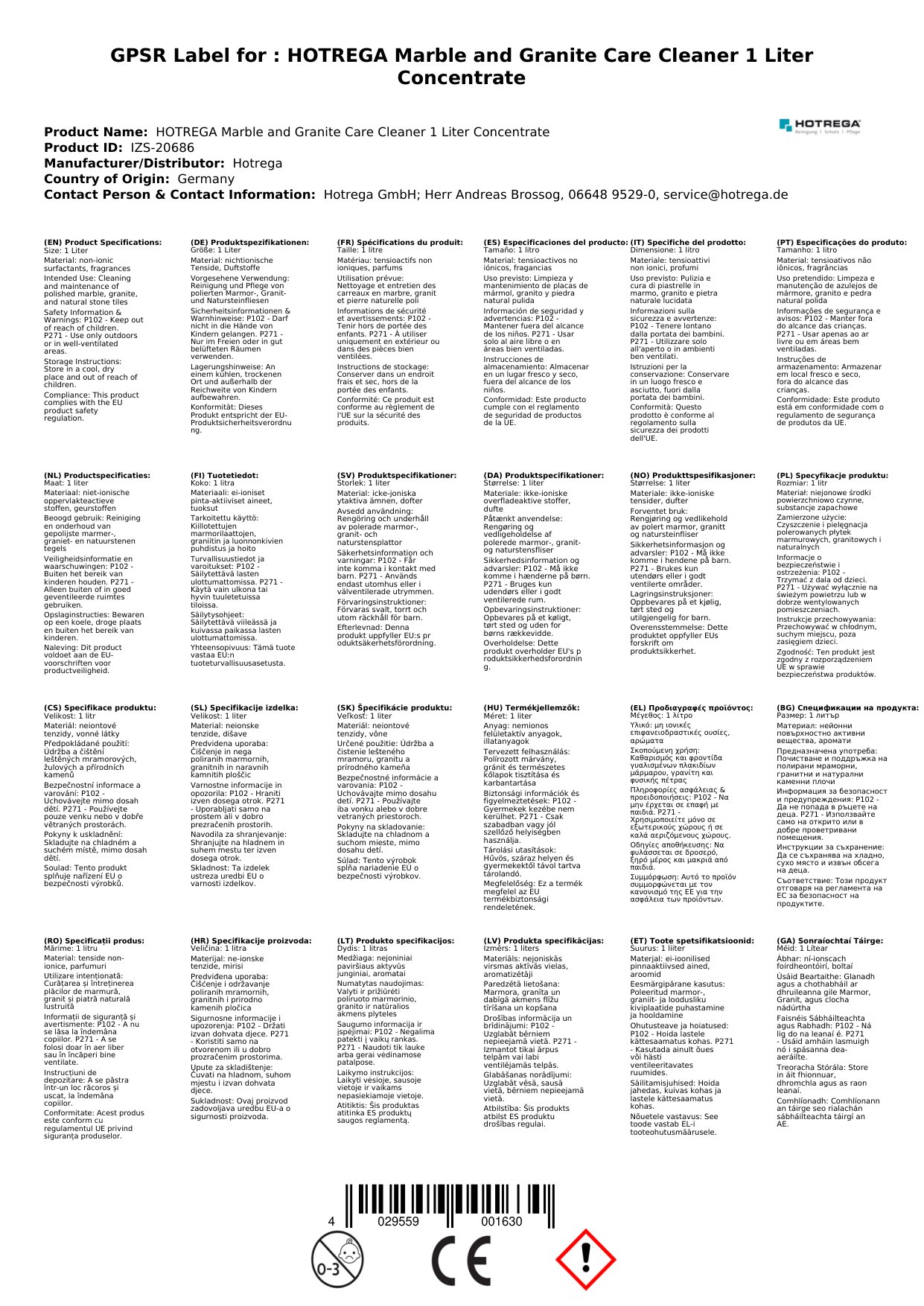 Hotrega Marmor- und Granit- Pflegereiniger 1 Liter