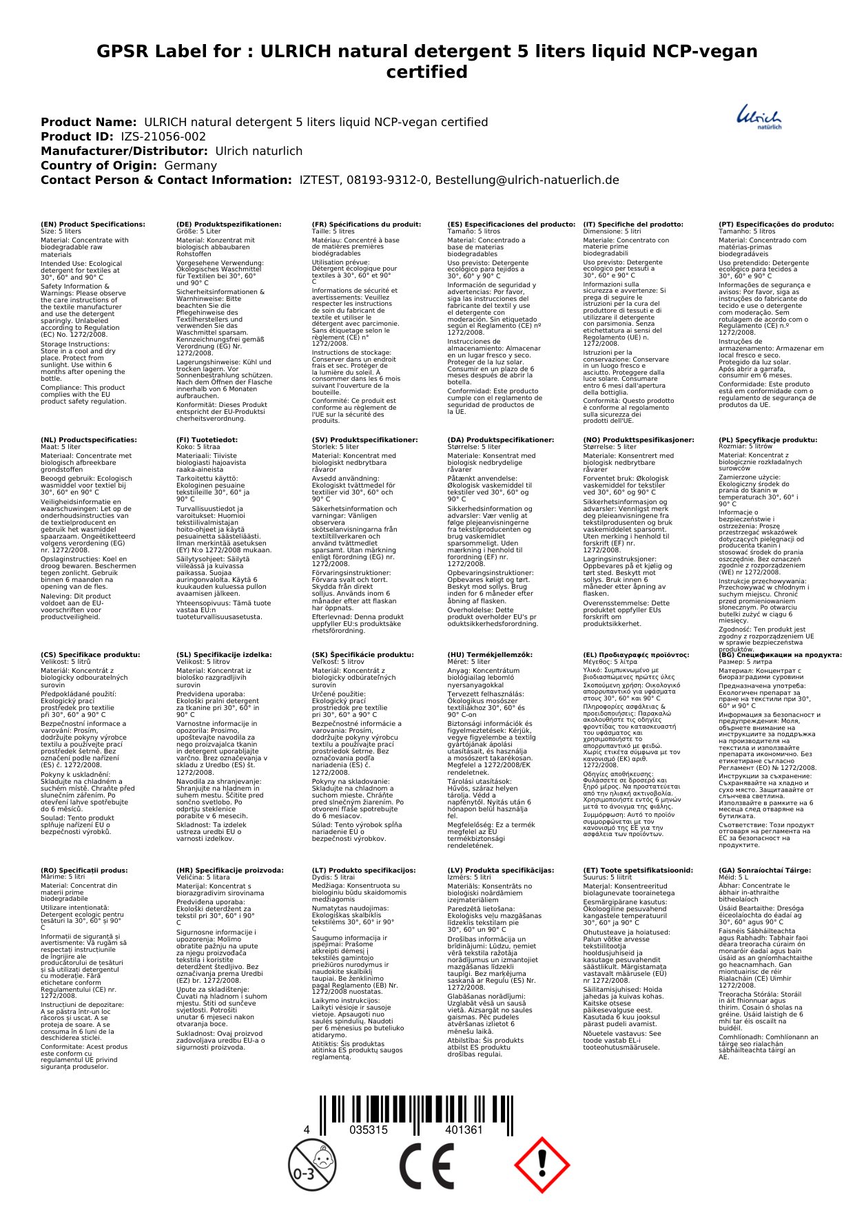 30 ml pro 4,5 kg Trockenwäsche genügen für gute Waschergebnisse. Die Zusammensetzung der einzelnen Rohstoff Komponenten wurde in enger Abstimmung mit der Positivliste des Nature Care Product Standards ( NCPS ) getroffen. Die eingesetzten Rohstoffe des Ulrich natürlich Waschmittel sind leicht biologisch abbaubar und daher sehr umweltfreundlich