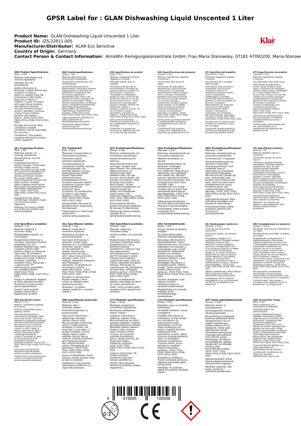 Ingredients (INCI): Aqua, Lauryl Polyglucose, Fettalkoholsulfat C12-14 Natriumsalz, Glycerin, Alcohol Denat., Sodium Chloride, Benzyl Alcohol, Lactic Acid