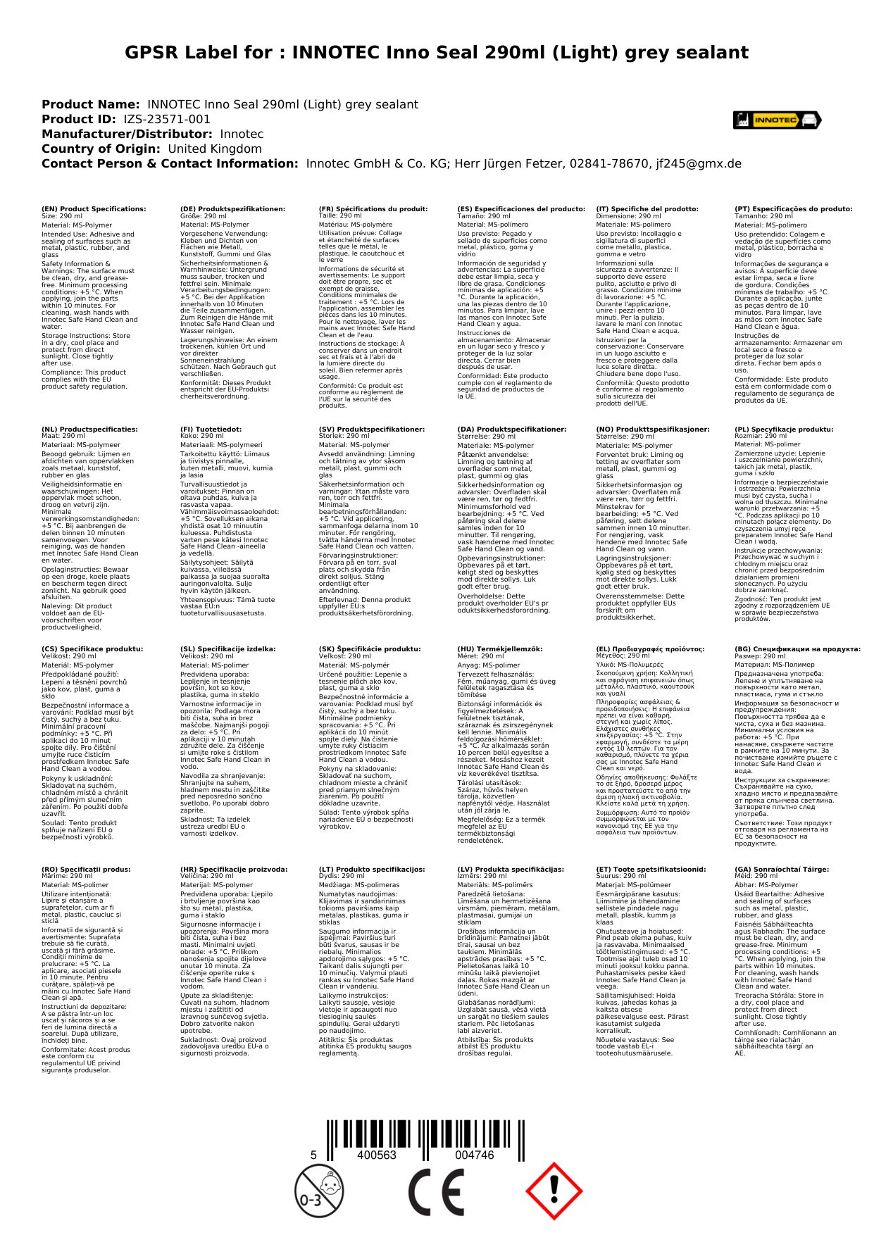 Inno-Seal ist eine einzigartige, dauerhaft elastische, Dichtmasse mit Klebeeigenschaften auf Basis von MS-Polymeren. Das Produkt eignet sich zum Verkleben oder Abdichten und hat ein gutes Haftvermögen auf den geläufigsten Flächen, wie Metall, Kunststoff, Gummi und Glas. Es bildet innerhalb kurzer Zeit eine Haut, trocknet schnell durch und besitzt eine enorme Elastizität.