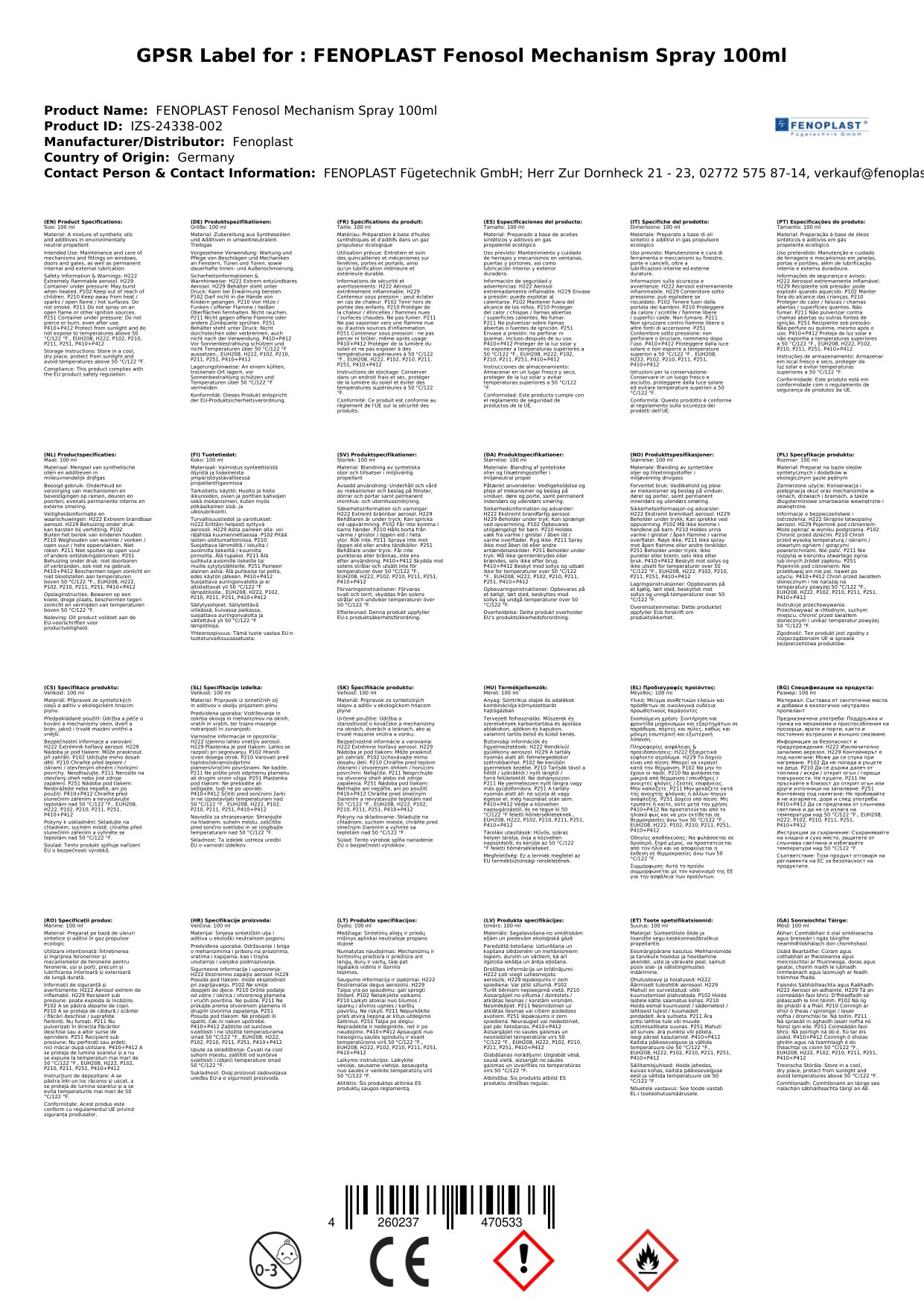 Fenosol BESCHLÄGESPRAY - Spezial Wartungs- und Pflegemittel für Beschlag und Mechanik an Fenstern, Türen, Toren
