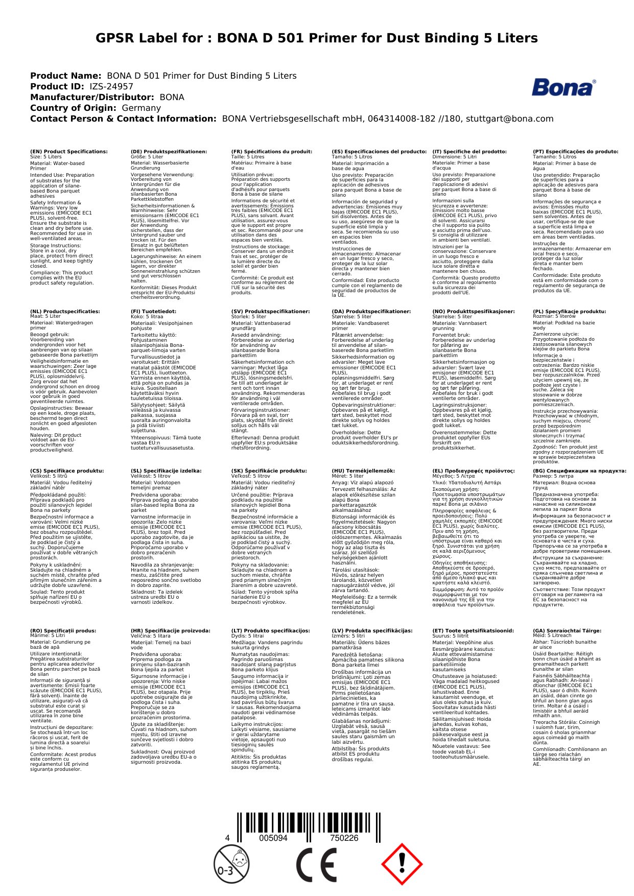 Bona D501 ist eine Grundierung zur Vorbereitung von Untergründen vor dem Einsatzvonsilanbasierten Bona Parkettklebstoffen, insbesondere R845,R848,R850, R850T und R860. Bona D501 ist geeignet auf saugfähigen Untergründen wie Estrichen, Spanplatten, Verlegeplatten und ähnlichem mehr- ausgenommen Magnesia Industrieestriche und Steinholzestriche.