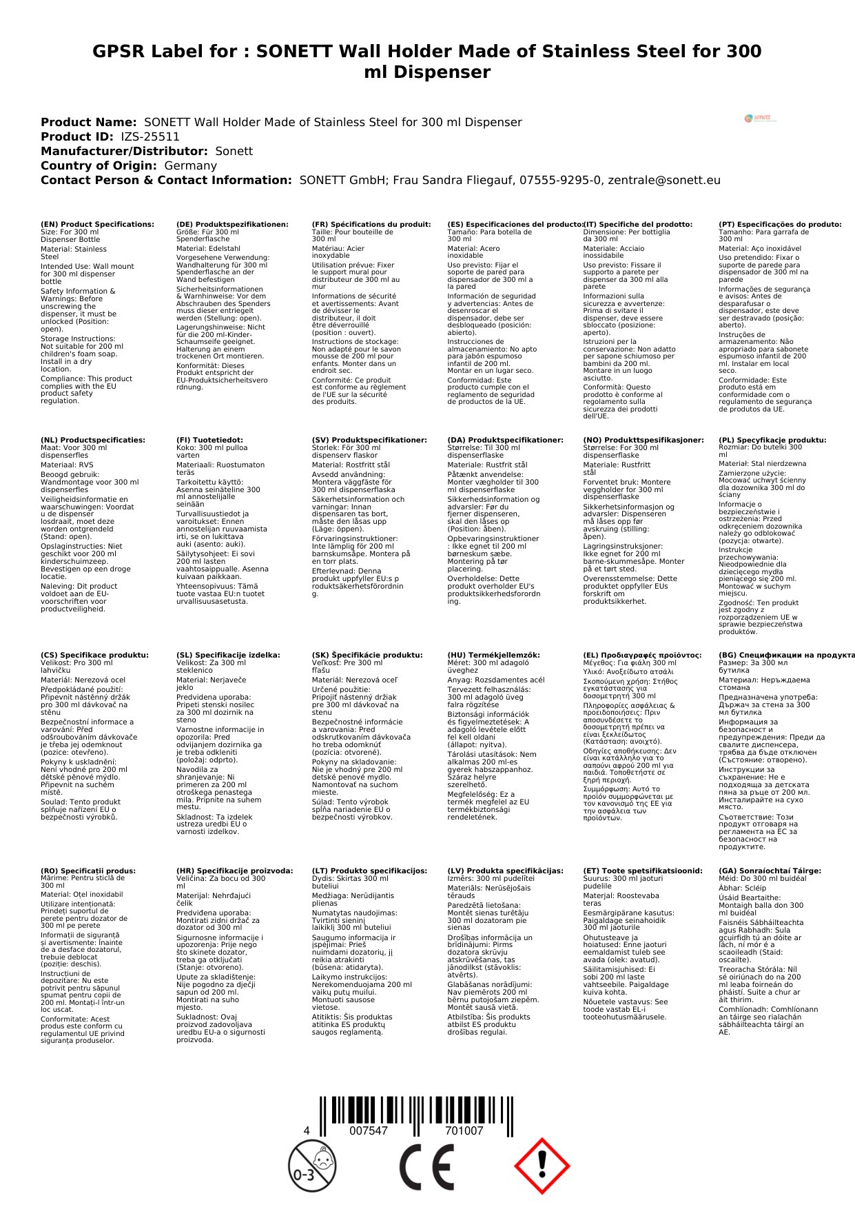 SONETT Wandhalter aus Edelstahl für 300 ml Spender