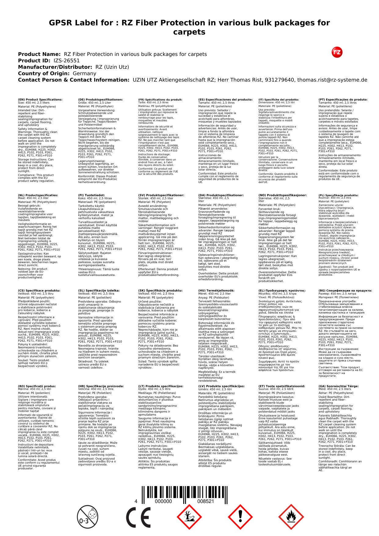 Schmutzabweisende und polstabilisierende Versiegelung / Imprägnierung für alle Teppiche, Teppichböden und Polstermöbel (Synthetik und Woll), die auf den farb- und wasserbeständigen Bodenbelag aufgesprüht wird. Anwendung jedoch nur nach der Grundreinigung mit dem RZ Teppichwaschsystem.
