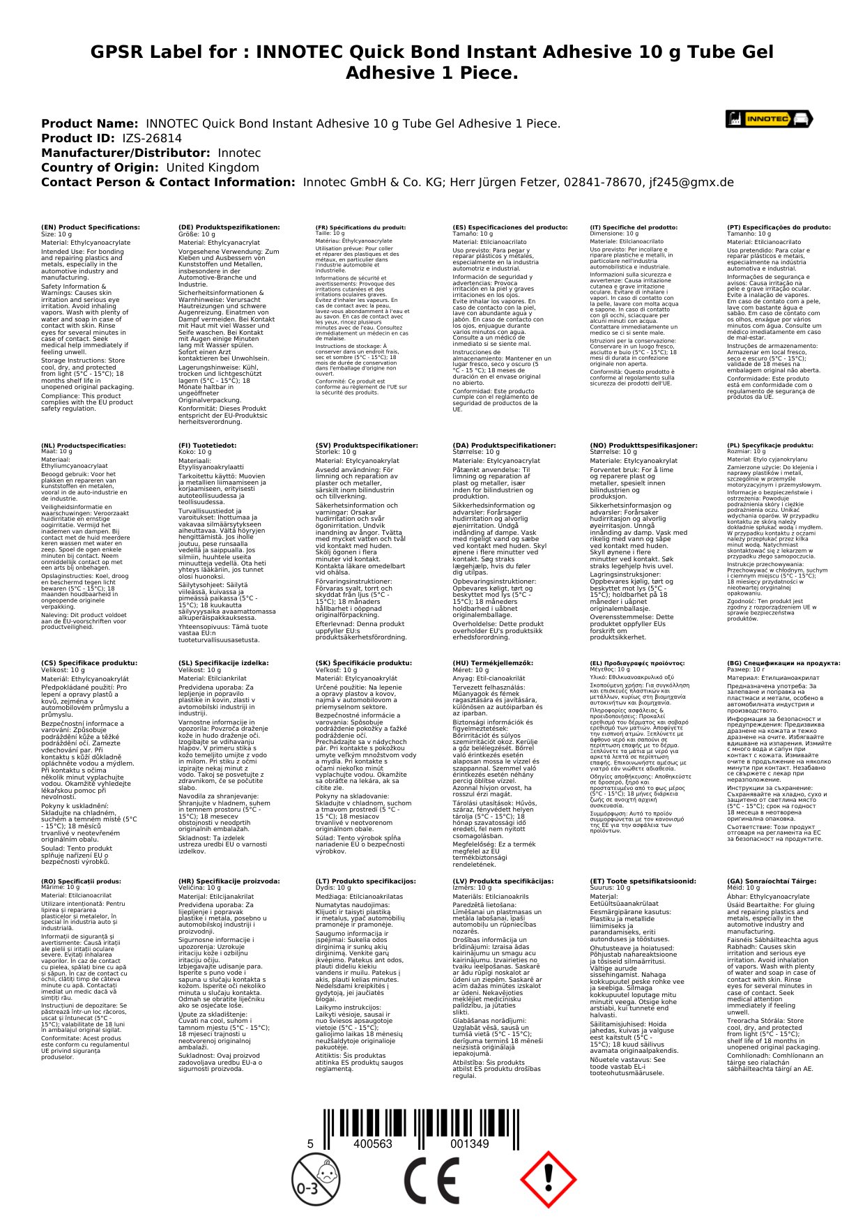EUH202 - Cyanacrylat. Gefahr. Klebt innerhalb von Sekunden Haut und Augenlider zusammen. Darf nicht in die Hände von Kindern gelangen