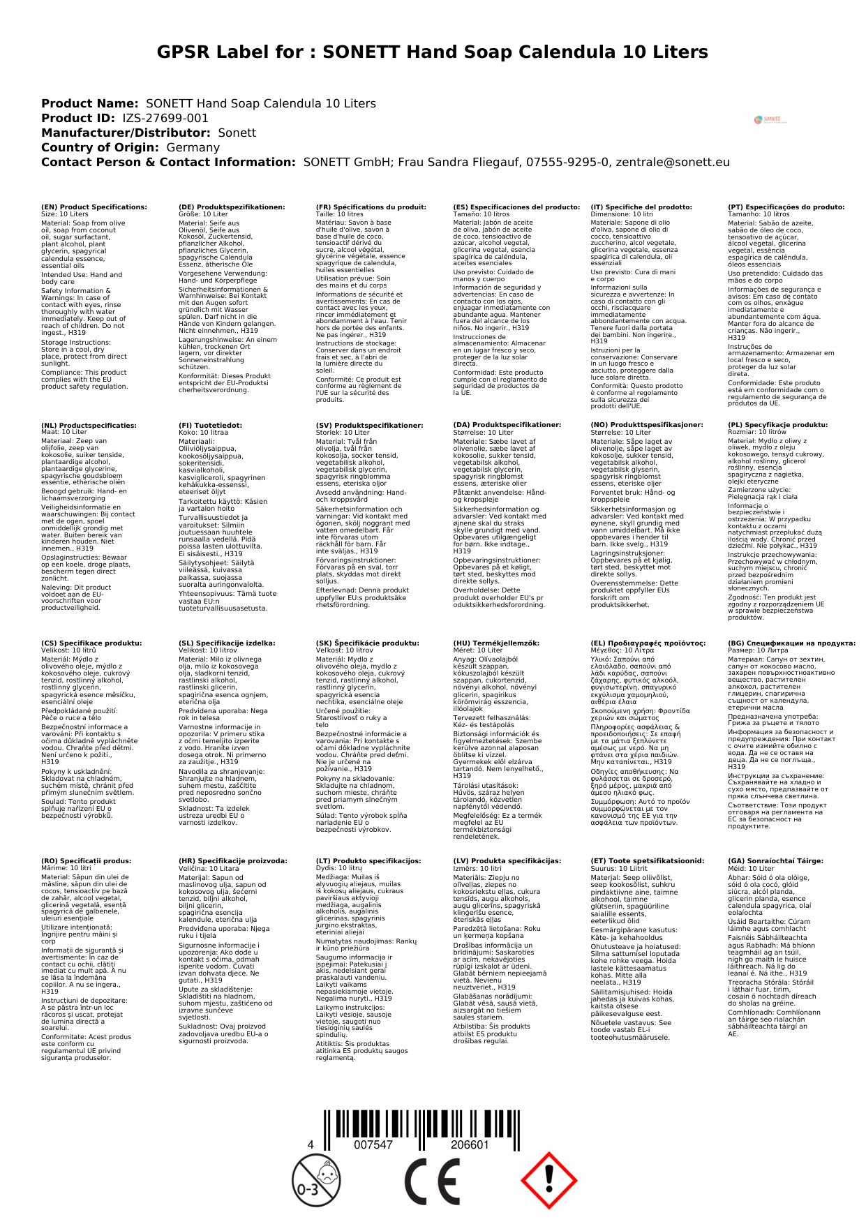 SONETT Handseife Calendula 10 Liter