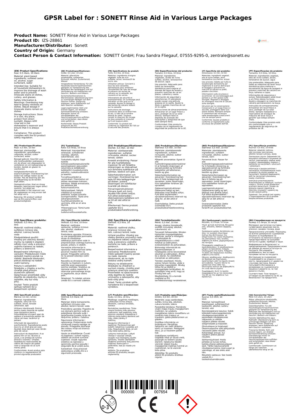 Für alle Haushalts-Geschirrspülmaschinen geeignet in Kombination mit Sonett Maschinenspülmittel oder Sonett Tabs für die Geschirrspülmaschine und Sonett Regeneriersalz.