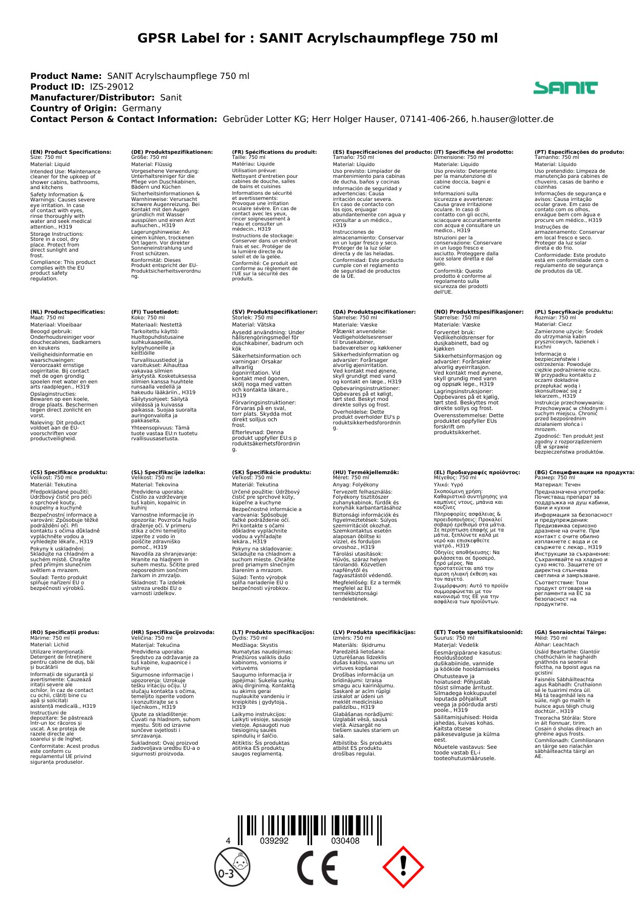 AcrylSchaumPflege beseitigt mühelos, gründlich und schonend Kalk-, Wasser, und Seifenrückstände an Duschwannen, Fliesen und Armaturen. SANIT ist der ideale Unterhaltsreiniger für die Pflege von Duschkabinen, Bädern und Küchen und sorgt für strahlenden Glanz.