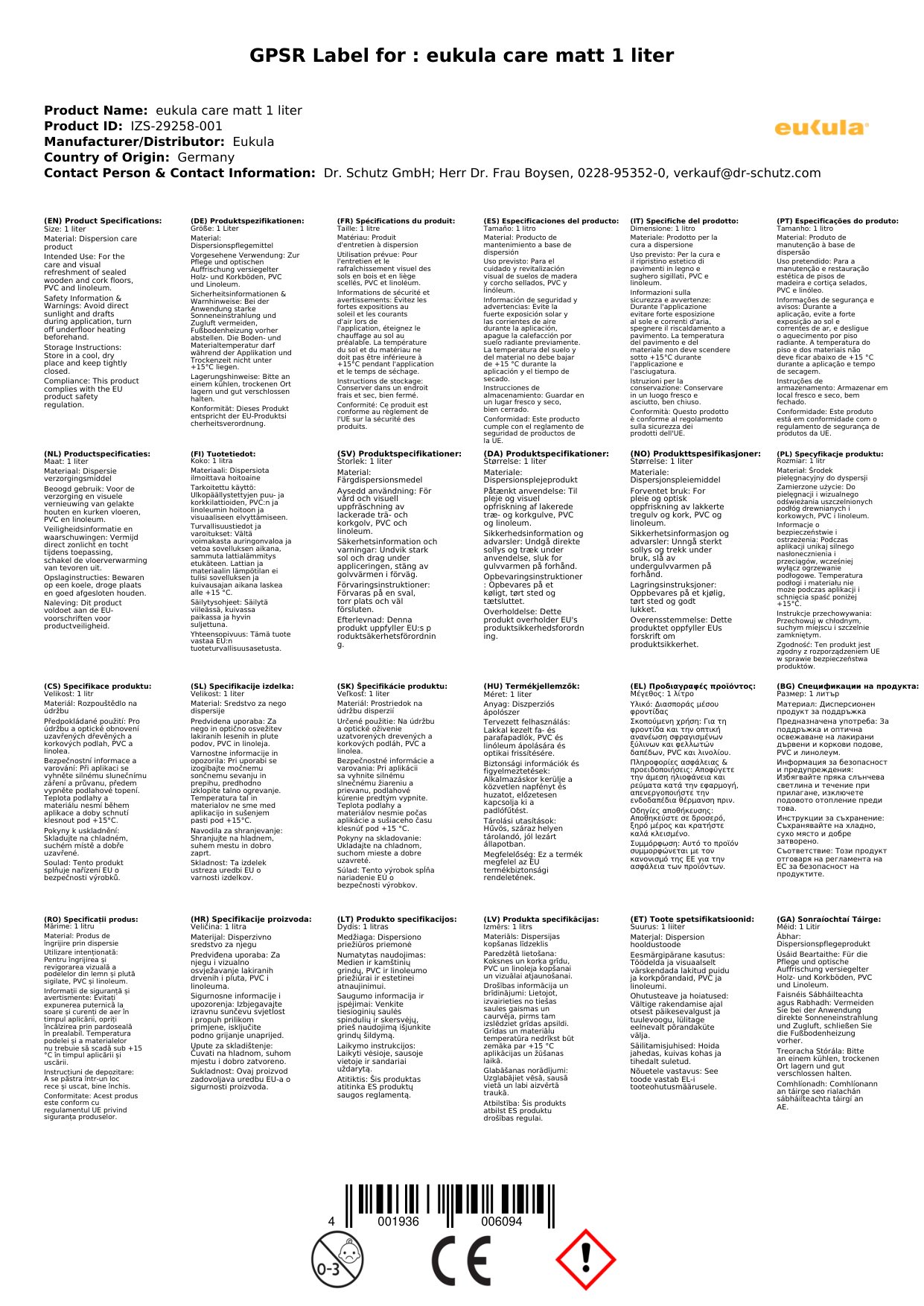 | Trockenzeit | Bei unverdünnter Anwendung als Vollpflege die Fläche vor Benutzung gut durchtrocknen lassen (12 Stunden, idealerweise über Nacht, bei 23 °C, 50% rel. LF, Lüftung). |