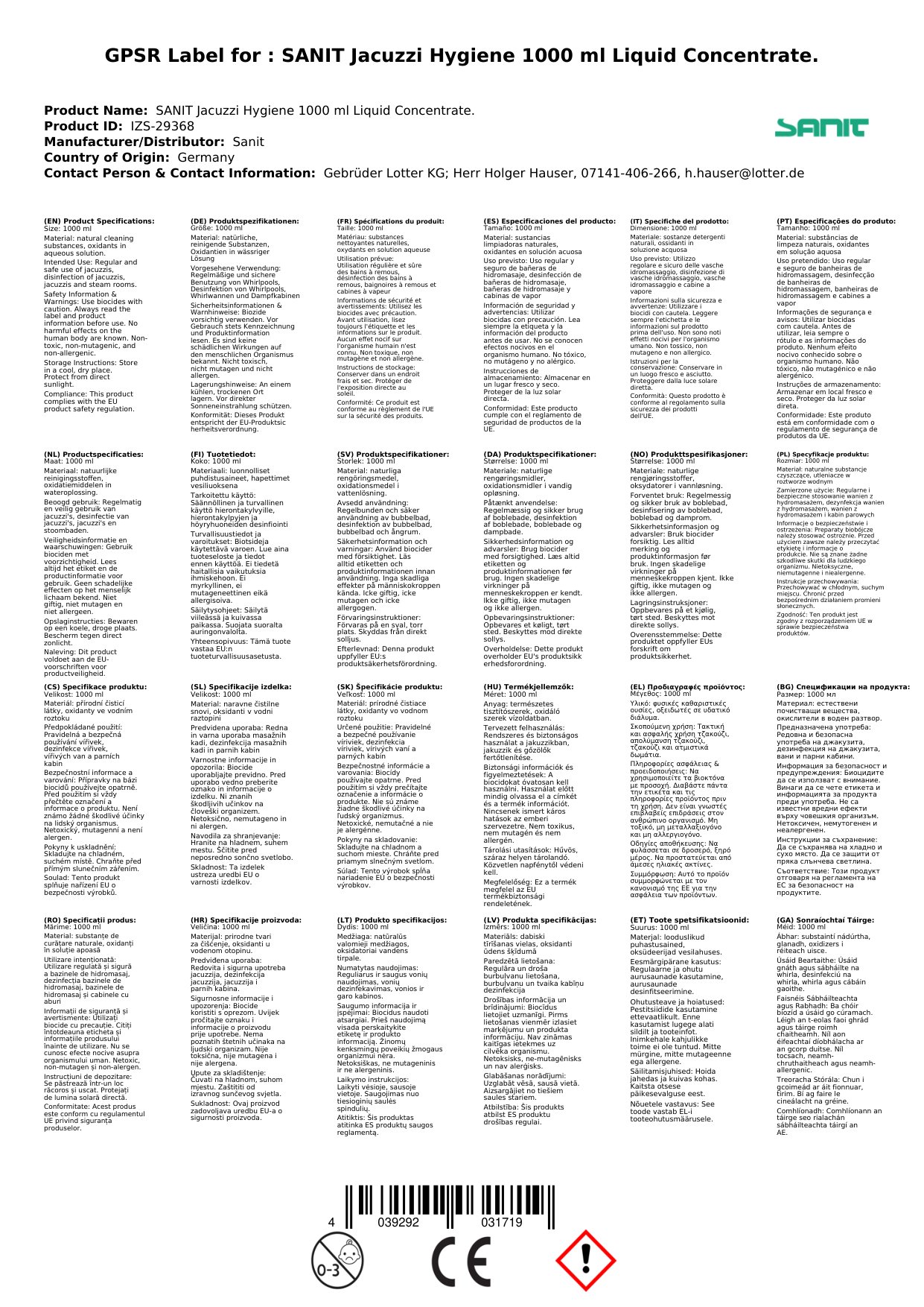 - SANIT WhirlpoolDesinfektionsmittel ist pH-Neutral, bewirkt keine Hautschädigungen, ist nicht toxisch, nicht mutagen und nicht allergen.