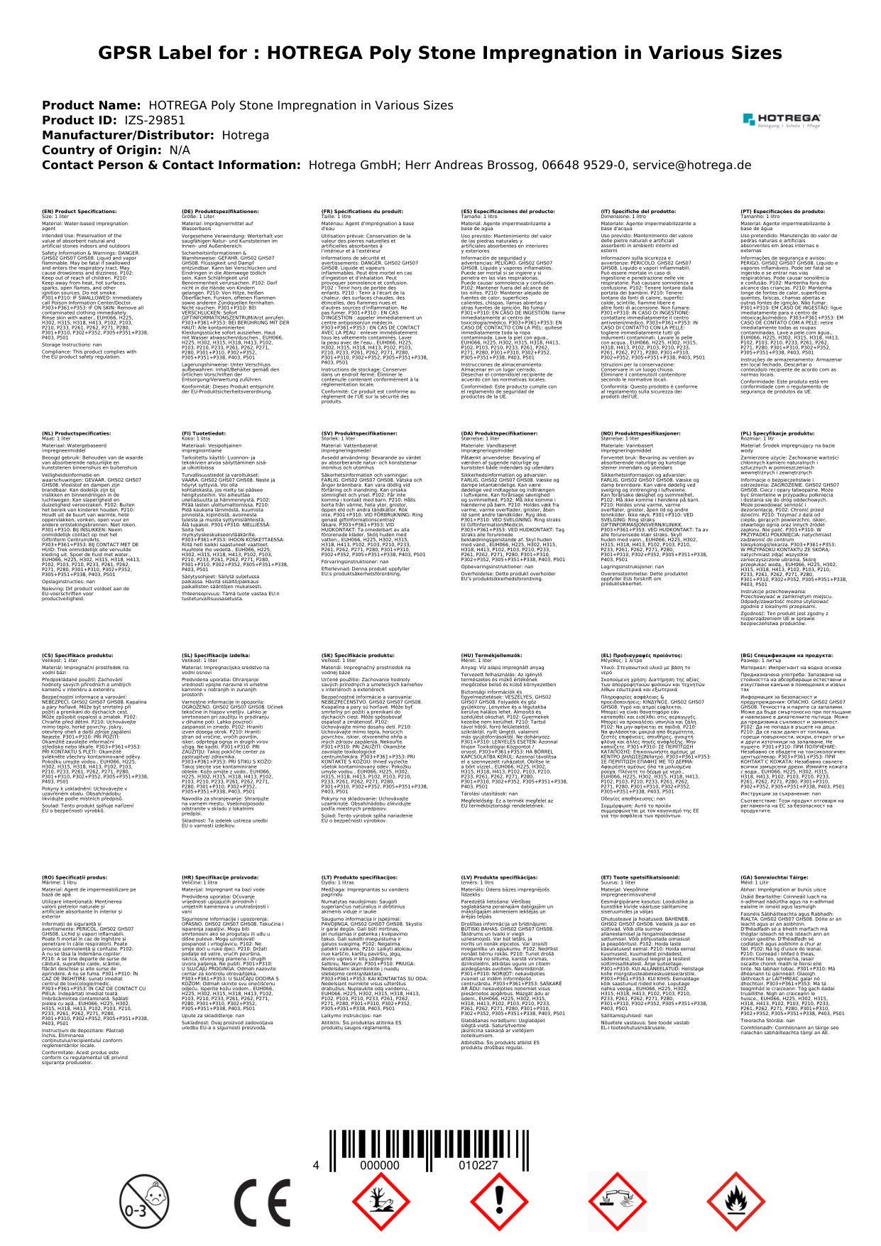 Stellen Sie eine Frage, um mehr über das Produkt zu erfahrenHotrega Poly Imprägnol Stein-Imprägnierung 1 Liter Dose