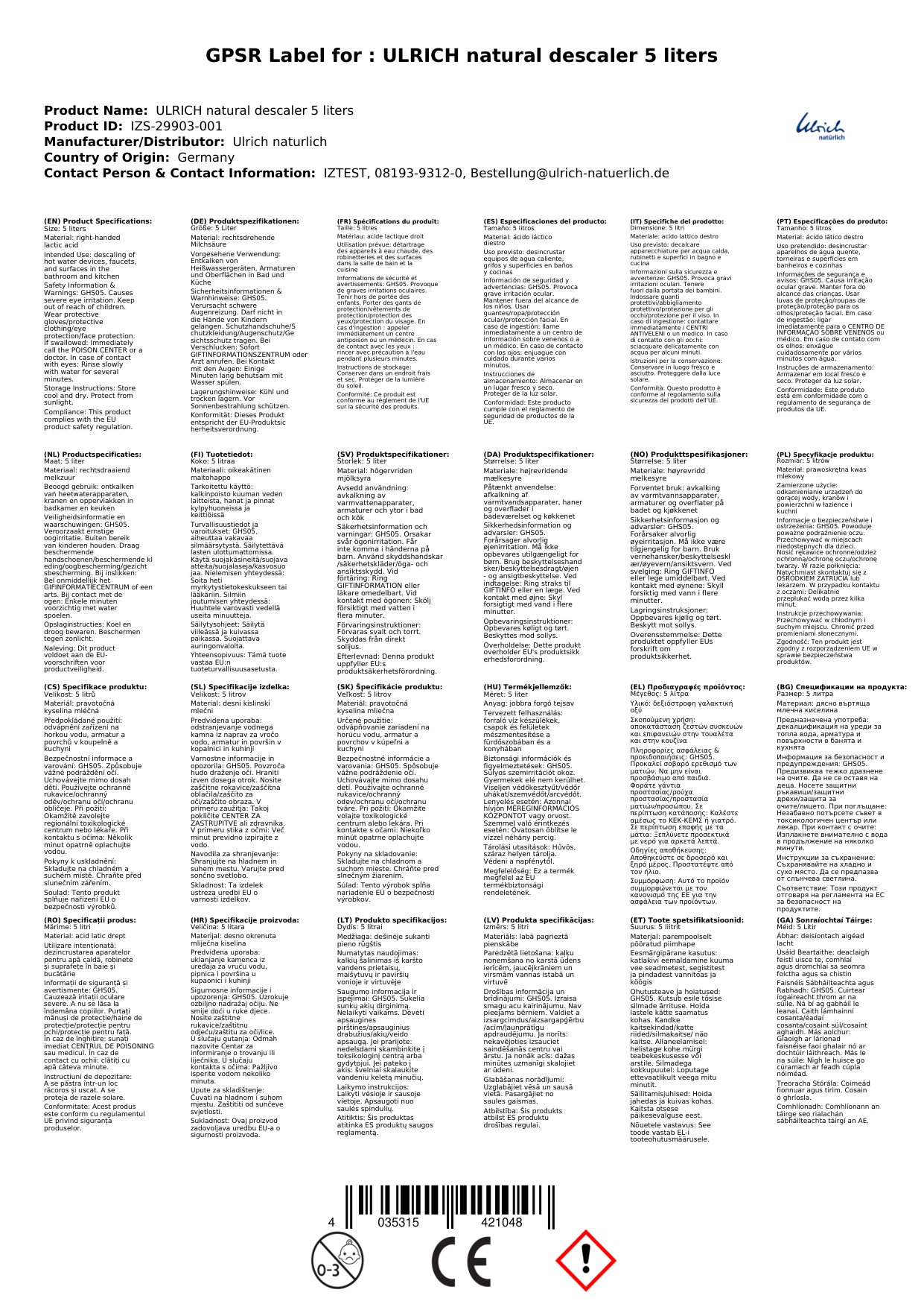 Ulrich natürlich Entkalker besteht aus reiner rechtsdrehender Milchsäure, die biologisch abbaubar und nicht wassergefährdend ist. Der Entkalker kann mit Wasser bis 1 : 5 verdünnt werden, wobei Erhitzen die Wirkung noch erhöht. Bitte Entkalkungsvorschriften der Gerätehersteller beachten.