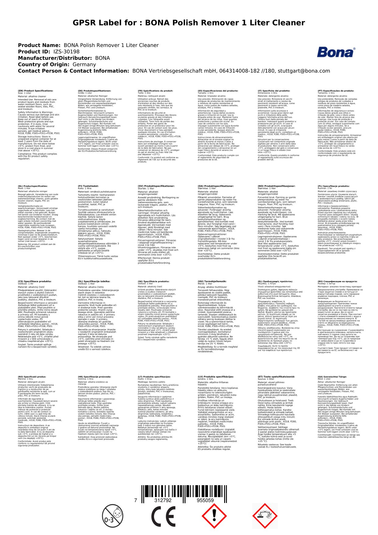 Bona Polish Entferner ist ein alkalischer Reiniger, mit dem alte Pflegemittelschichten und Rückstände von Böden entfernt werden können. Er ist für die Grundreinigung von allen wasserbeständigen Böden geeignet, wie z.B. versiegelte Holzböden, Fliesen, PVC und Linoleum.