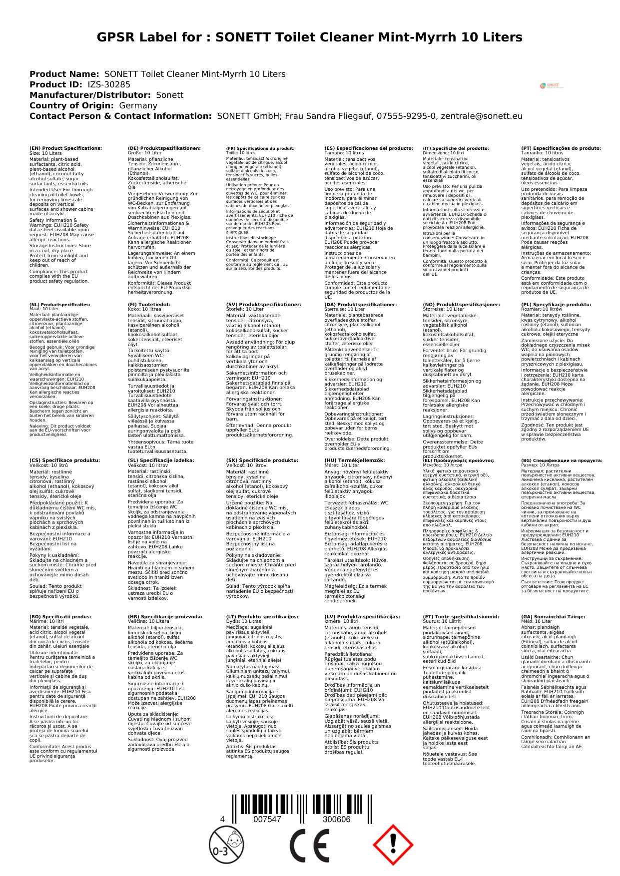 Stellen Sie eine Frage, um mehr über das Produkt zu erfahrenSONETT WC Reiniger 10 Liter Minze-Myrthe