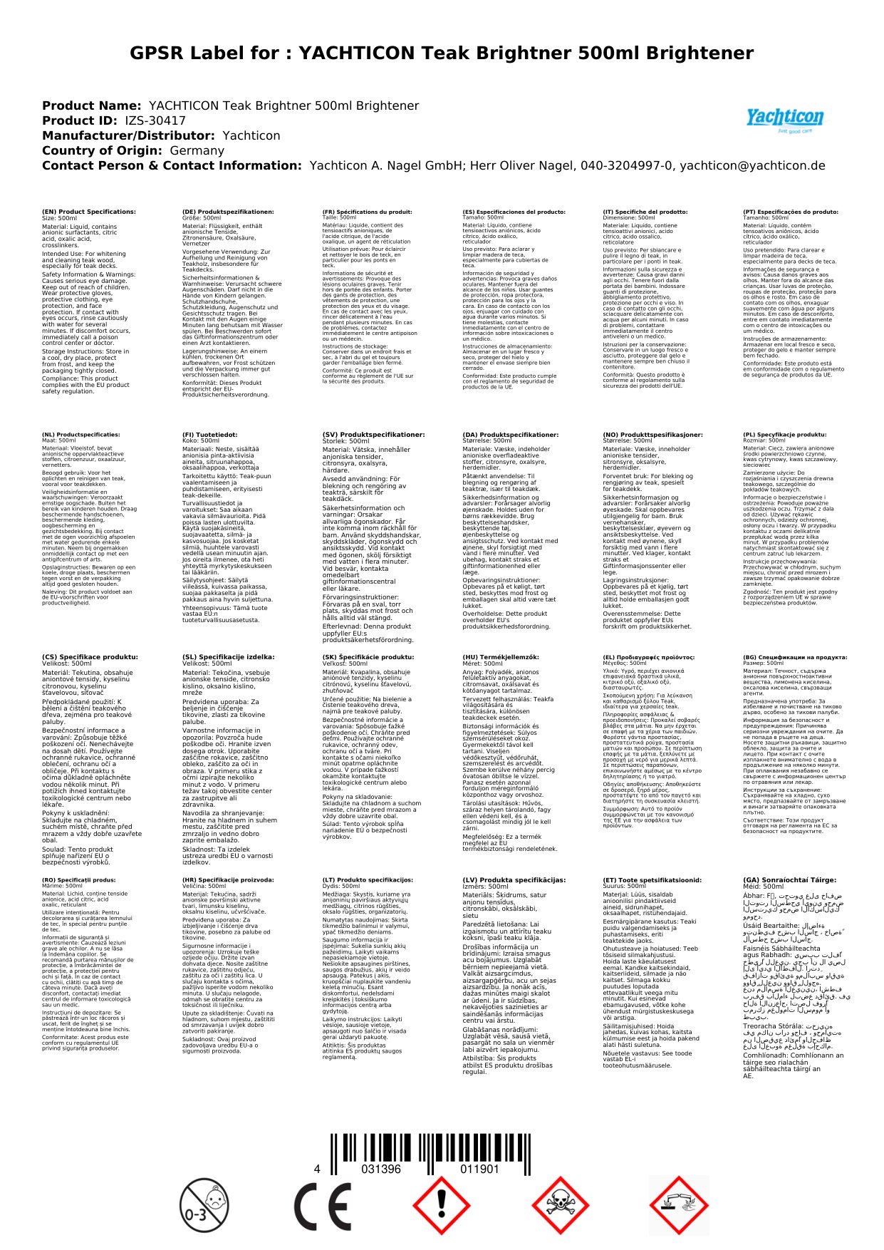 Gebrauchsanweisung: Das Deck mit Wasser abspülen. Vertielen Sie den Yachticon Teak Brightner gleichmässig auf dem Deck und warten Sie vor dem Nachspülen ca. 15-30 Minuten je nach Verschmutzungsgrad. Anschließend mit viel Wasser abschrubben.