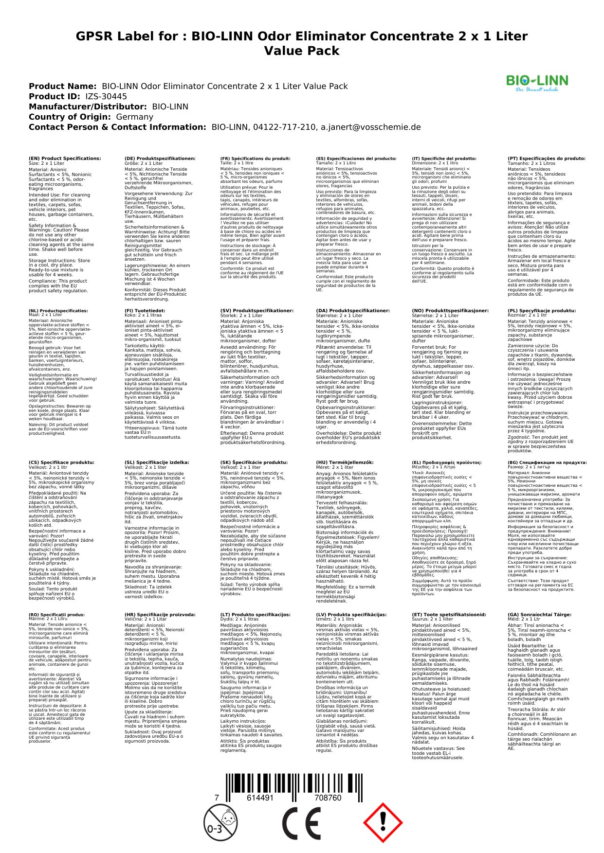 Bio-Linn Geruchsentferner fällt nicht unter die Richtlinien für Biozide.
