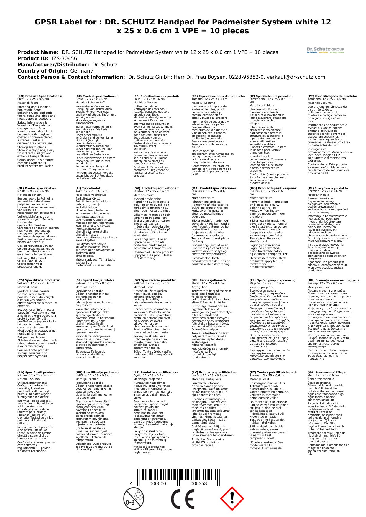 DR. SCHUTZ Handpad für Padmeister System weiß 12 x 25 x 0,6 cm 1 VPE = 10 Stück