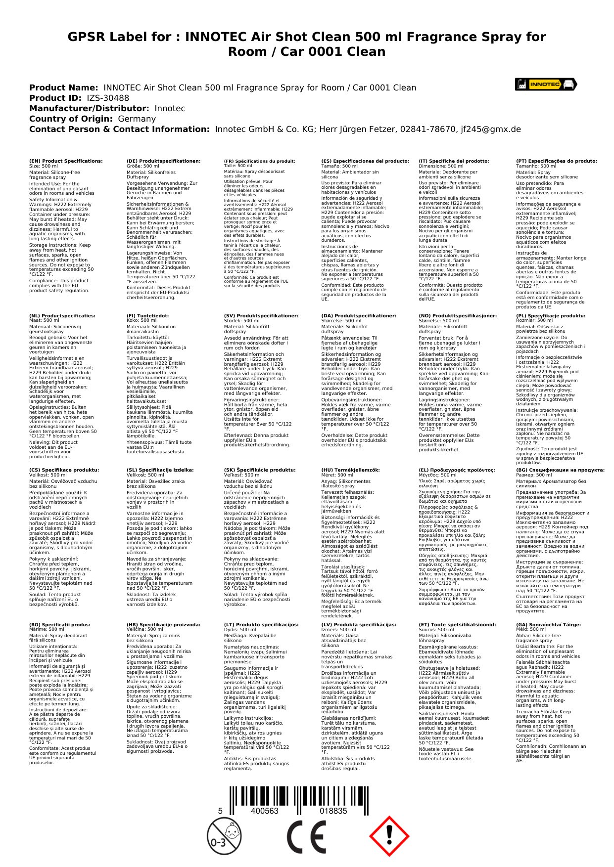 INNOTEC Air Shot Clean 500 ml Duftspray für Raum / Auto 0001 Clean