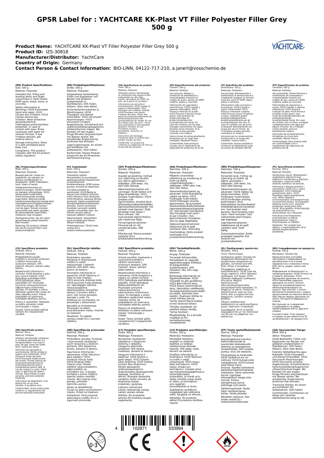 YACHTCARE KK-Plast VT Füllspachtel Polyesterspachtel grau 500 g