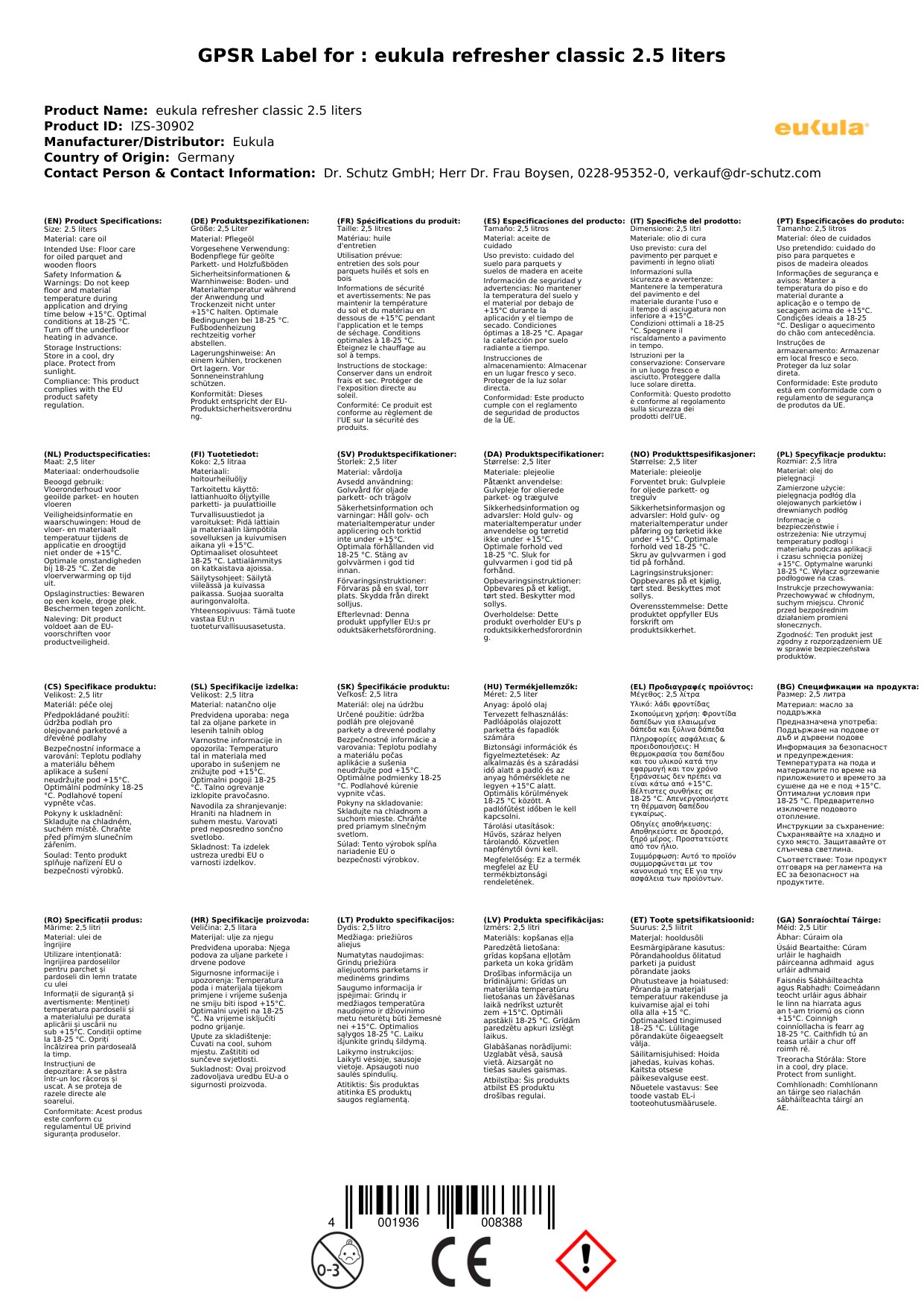 Der eukula refresher classic ist ein tiefenwirksames Pflegeöl zur Anwendung auf geölten Parkett- und Holzfußböden. Stumpfe, stark beanspruchte und intensivgereinigte Oberflächen werden wieder aufgefrischt und das Holz bekommt wieder neue Farbtiefe. Die Holzmaserung wird betont und erscheint in einem seidenmatten Oberflächenbild. Die Parkettpflege verfügt über ein gutes Eindringvermögen und hohe Füllkraft. Ohne Schichtbildung mit natürlichem, offenporigem Charakter. Geeignet für Holzböden aller Beanspruchungsklassen im Wohn- und Objektbereich, auch bei Fußbodenheizung.