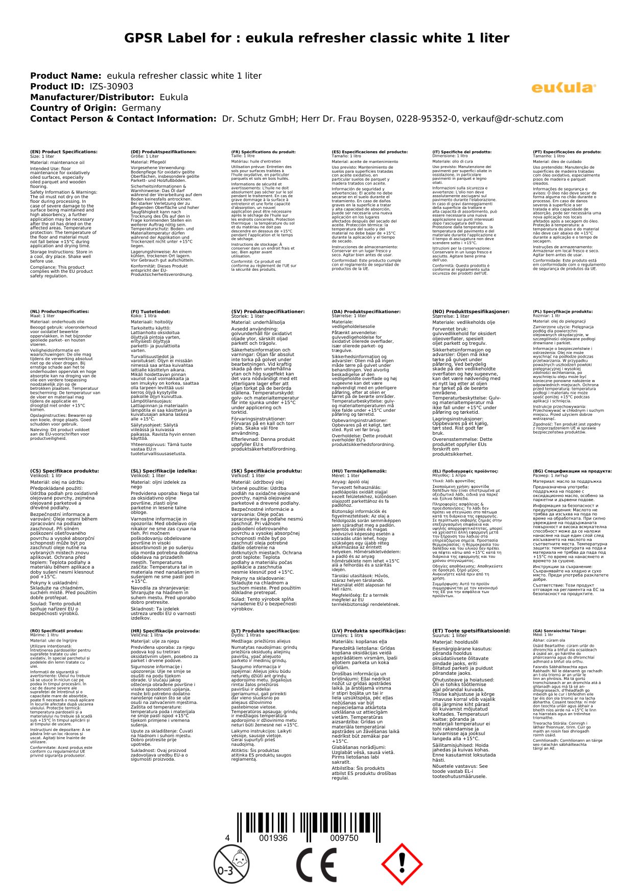 Der eukula refresher classic ist ein tiefenwirksames Pflegeöl zur Anwendung auf geölten Parkett- und Holzfußböden. Stumpfe, stark beanspruchte und intensivgereinigte Oberflächen werden wieder aufgefrischt und das Holz bekommt wieder neue Farbtiefe. Die Holzmaserung wird betont und erscheint in einem seidenmatten Oberflächenbild. Die Parkettpflege verfügt über ein gutes Eindringvermögen und hohe Füllkraft. Ohne Schichtbildung mit natürlichem, offenporigem Charakter. Geeignet für Holzböden aller Beanspruchungsklassen im Wohn- und Objektbereich, auch bei Fußbodenheizung.