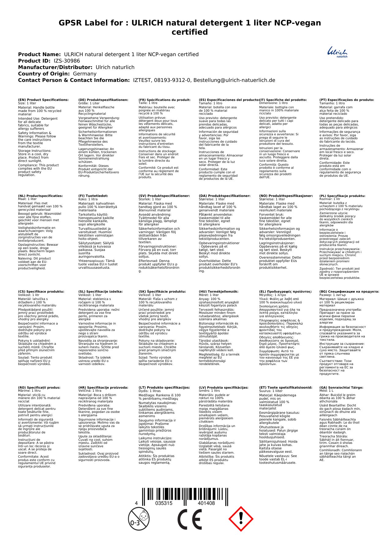 Erhalten Sie das Ulrich natürlich Feinwaschmittel in einer handlichen 1 L Henkelflasche aus 100 % Recyclingmaterial. Die umweltfreundliche Henkelflasche besteht aus 100 % Recyclat, welche ausschließlich aus kommunalen Abfällen ( Post Consumer Products ) besteht. Mit einem Eigengewicht von ca. 50 Gramm ist die Ulrich natürlich Henkelflasche ein echtes Fliegengewicht. Praktisch: Verschlossen ist die 1 L Henkelflasche mit dem Ulrich natürlich Dosierbecher, welcher 30 ml fasst.