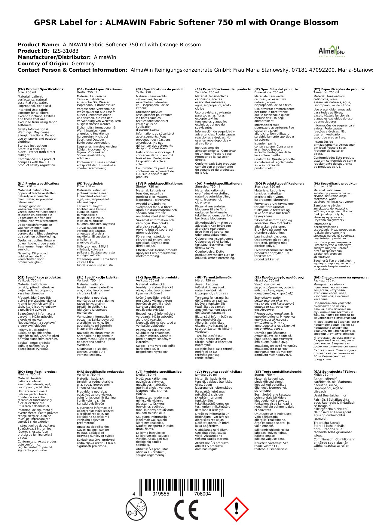ALMAWIN Weichspüler 750 ml mit Orangenblüte