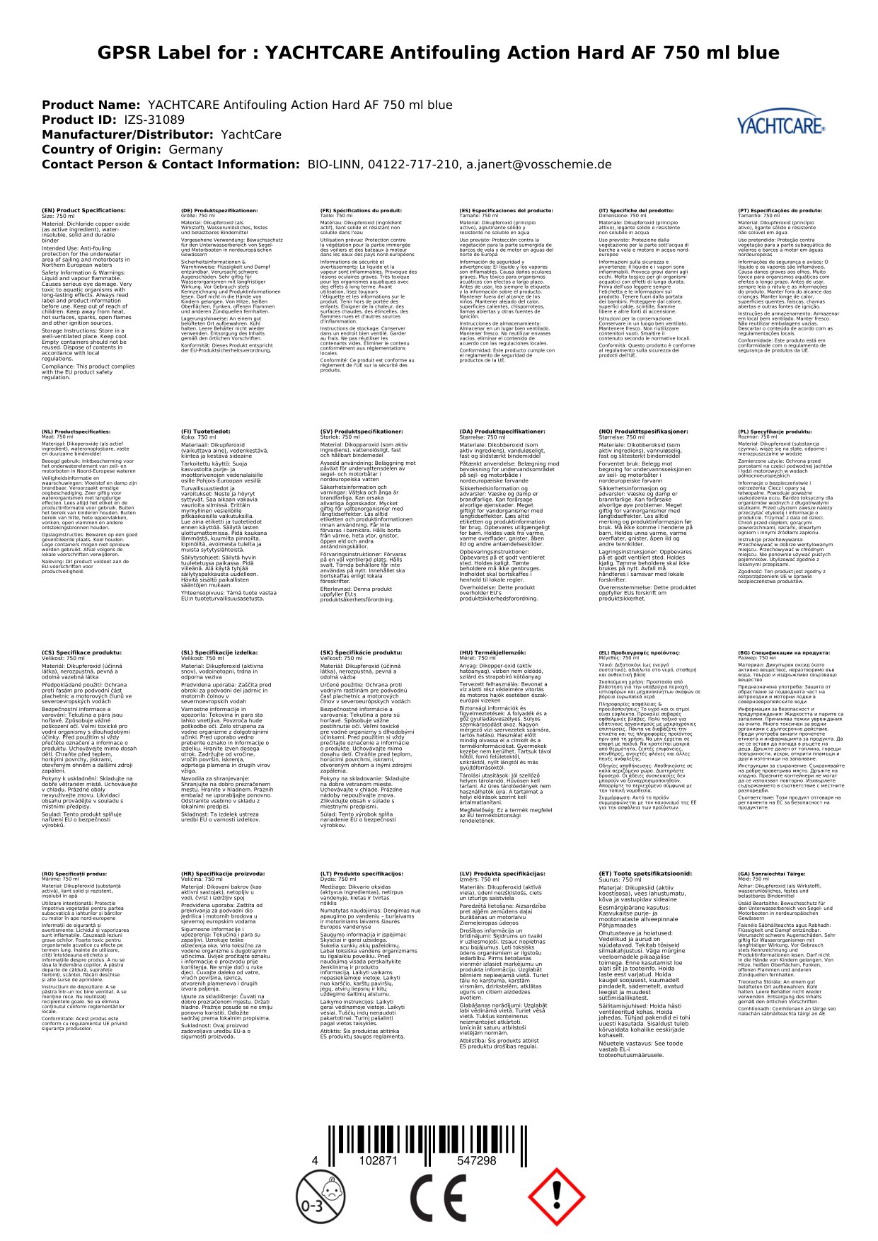 Yachtcare Antifouling Action Hard AF 750 ml blau
