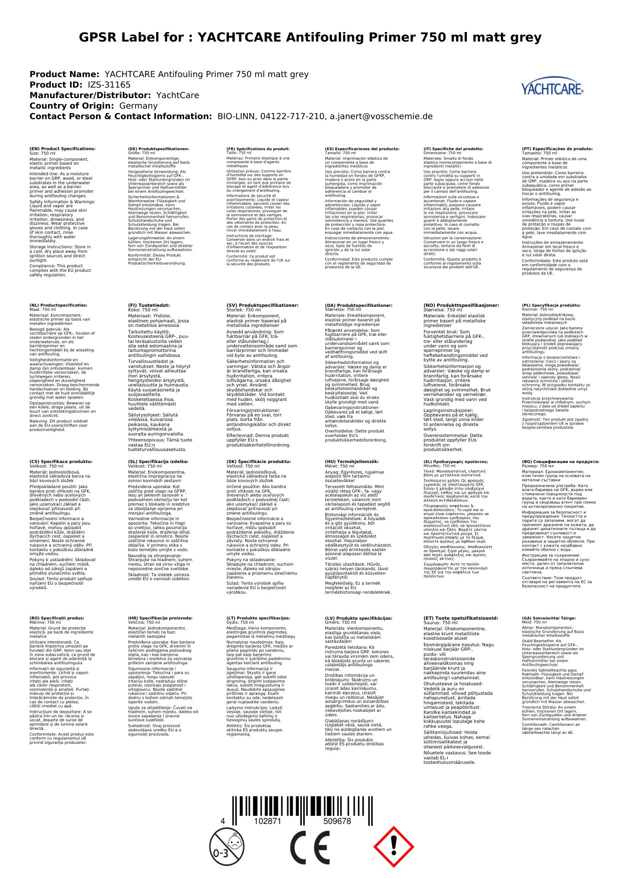 ANTIFOULING PRIMER ist eine einkomponentige, elastische Grundierung zur Beschichtung des Unterwasserbereiches. Die im Primer enthaltenen Metallplättchen bilden ein Schuppengeflecht, das einen hochwertigen Schutz gegen eindringende Feuchtigkeit auf GFK, Holz oder metallischen Untergründen bietet. Der Primer ist für eine dauerhafte Wasserbelastung geeignet und als Folgeanstriche sind Antifoulings zu verwenden.