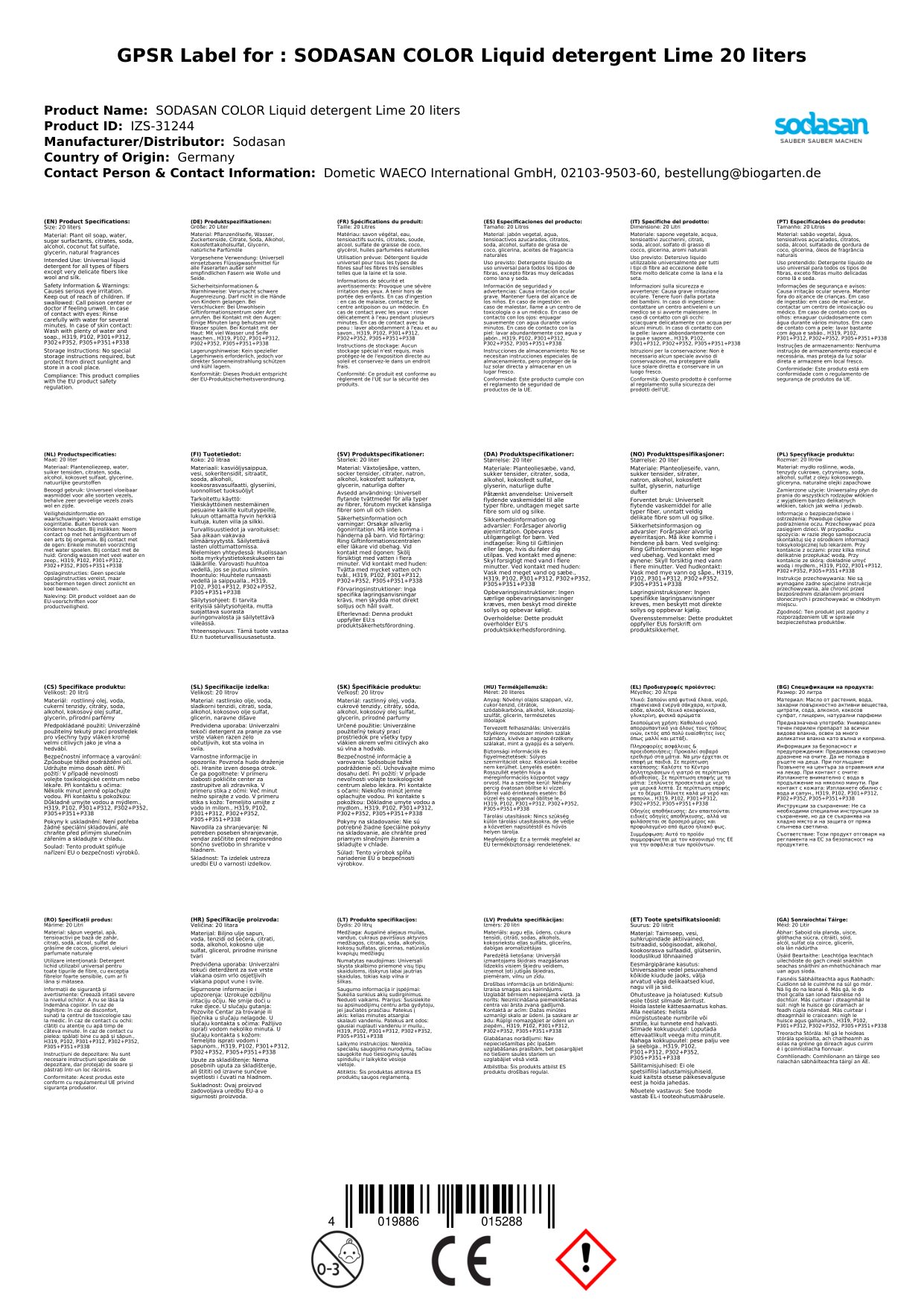 SODASAN Color Flüssigwaschmittel Limette 20 Liter