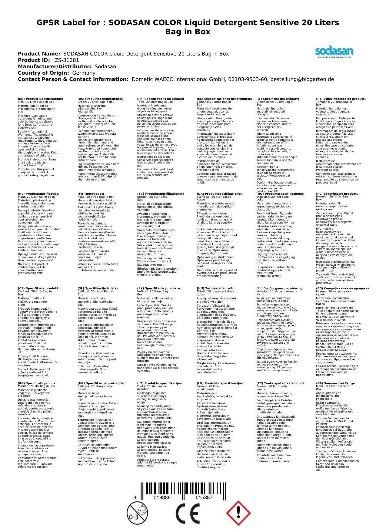 Das Produkt ist nicht kennzeichnungspflichtig hinsichtlich der haut- und augenreizenden Wirkung auf Grund eines Treuhänder Gutachtens. Andere Kennzeichnungen gemäß CLP Verordnung sind nicht erforderlich.