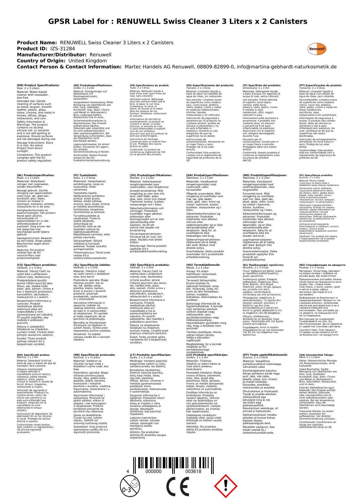 Stellen Sie eine Frage, um mehr über das Produkt zu erfahrenRENUWELL Swiss Reiniger 2 x 3 Liter