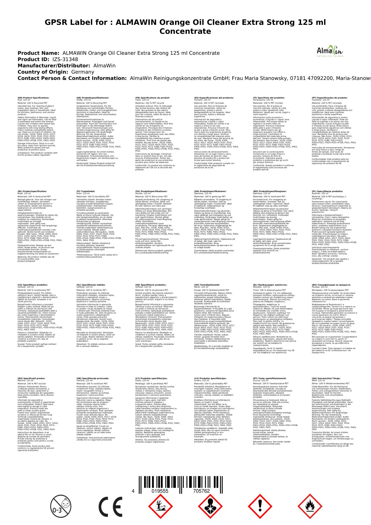 Almawin Orangenöl Reiniger extra stark enthält: Alkohol C12-C14 ethoxyliert, Orangenterpen.