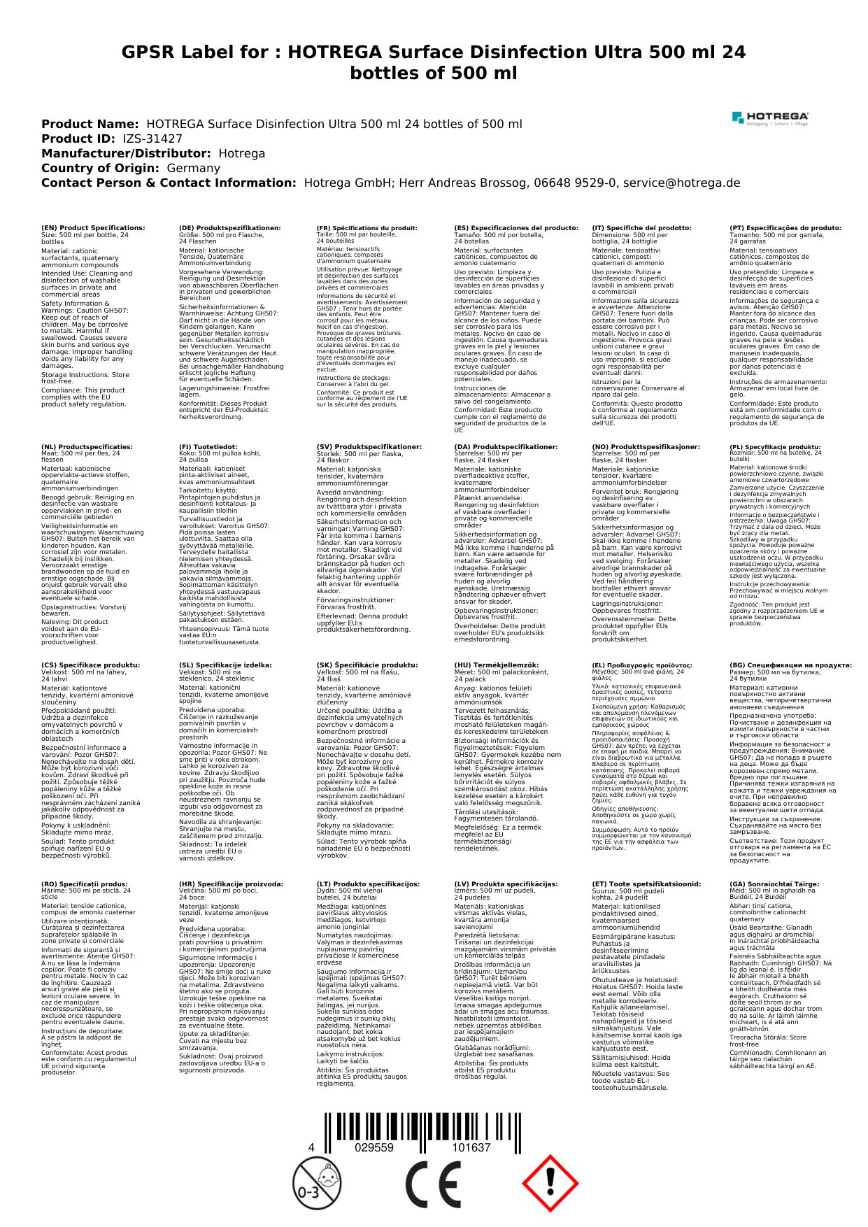 HOTREGA Flächendesinfektion Ultra 500 ml 24 Flaschen á 500 ml
