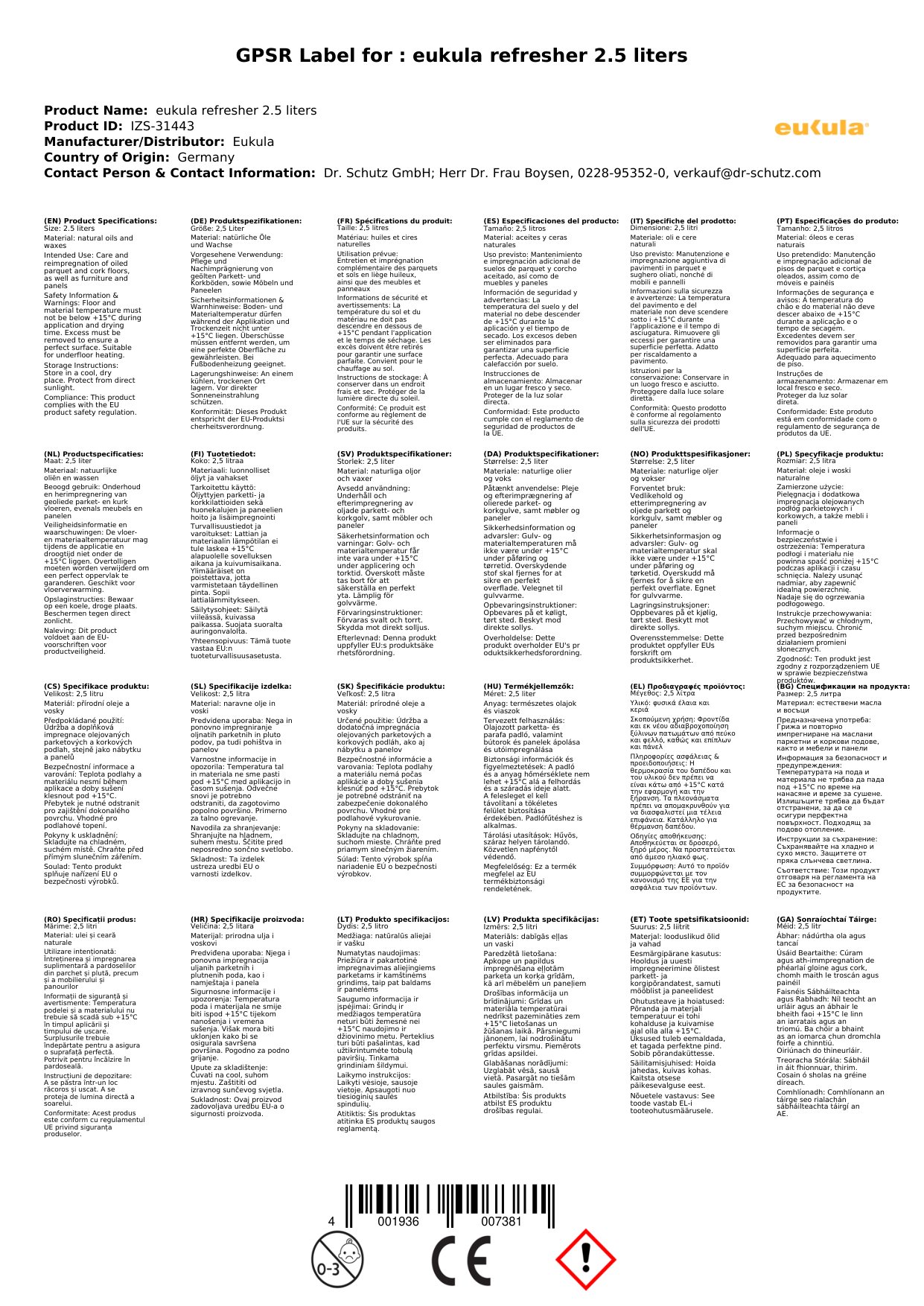 Der eukula refresher ist ein Parkettpflegemittel zur Auffrischung und Nachimprägnierung von geölten Parkett- und Korkböden. Zur Anwendung aller Beanspruchungsklassen im Wohn- und Objektbereich.