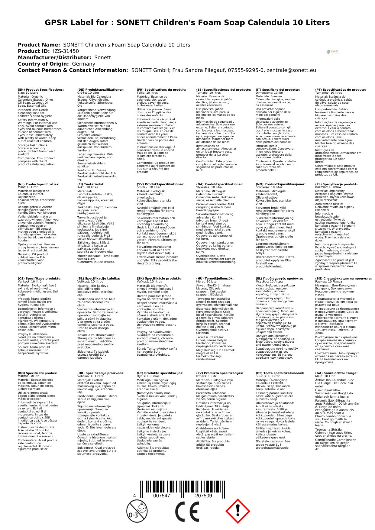 SONETT Kinder Schaumseife Calendula 10 Liter