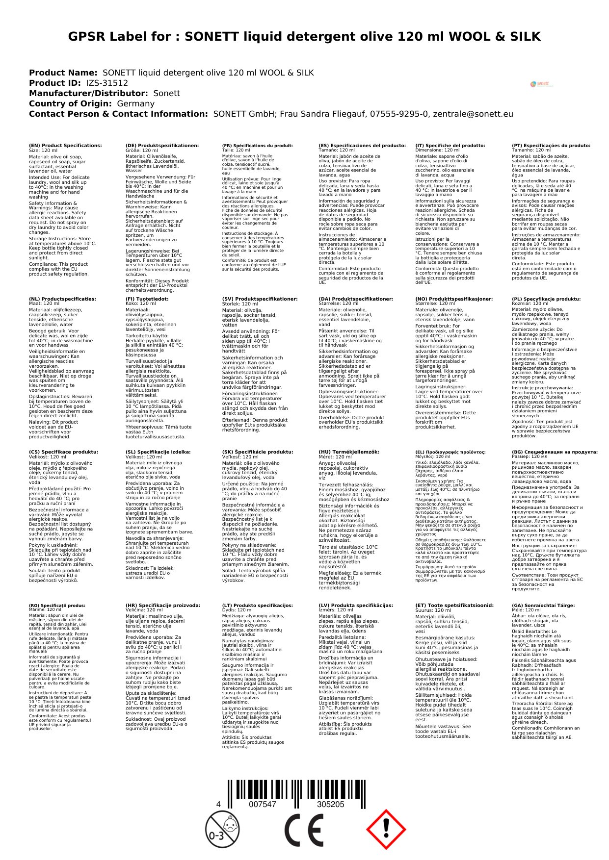 SONETT Waschmittel flüssig Olive 120 ml WOLLE & SEIDE