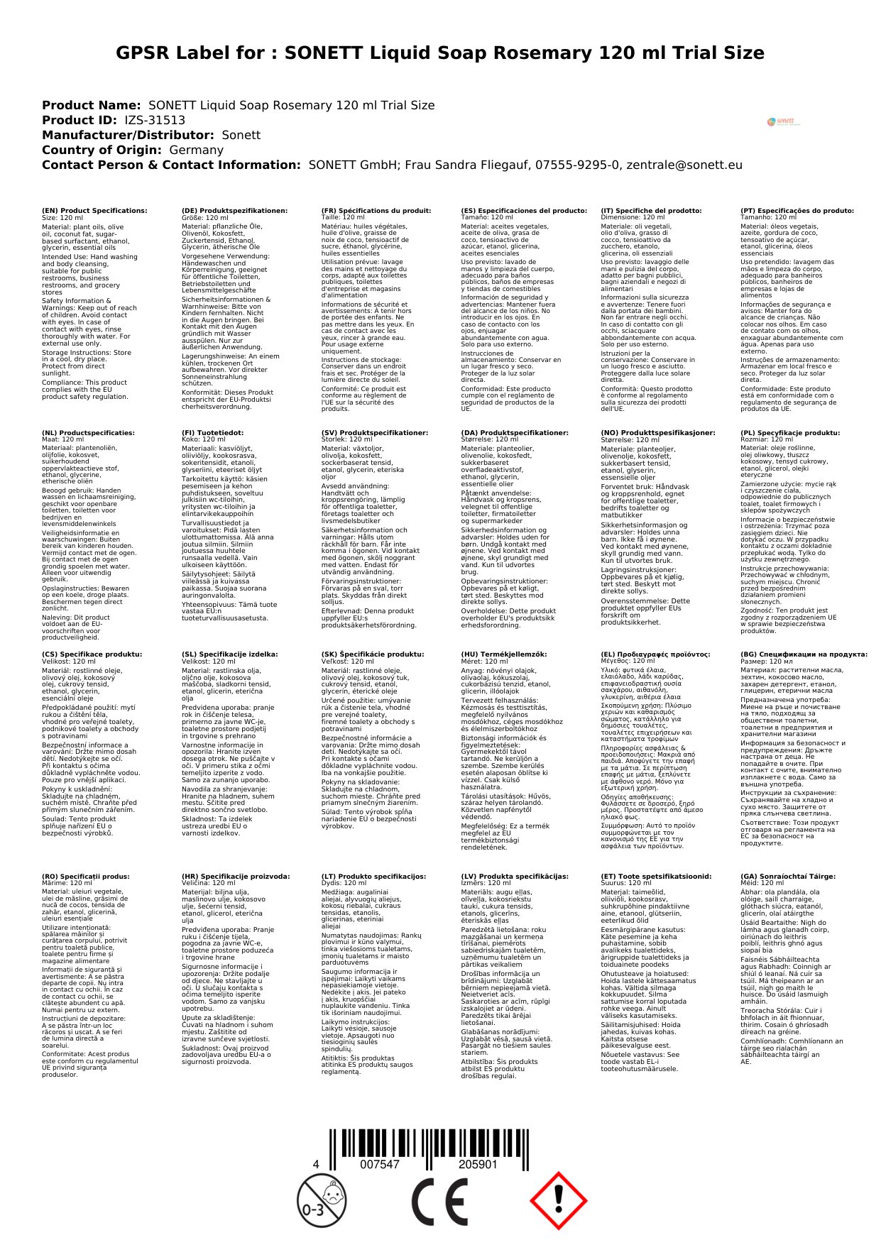 SONETT Handseife Rosemarin 120 ml Probiergröße
