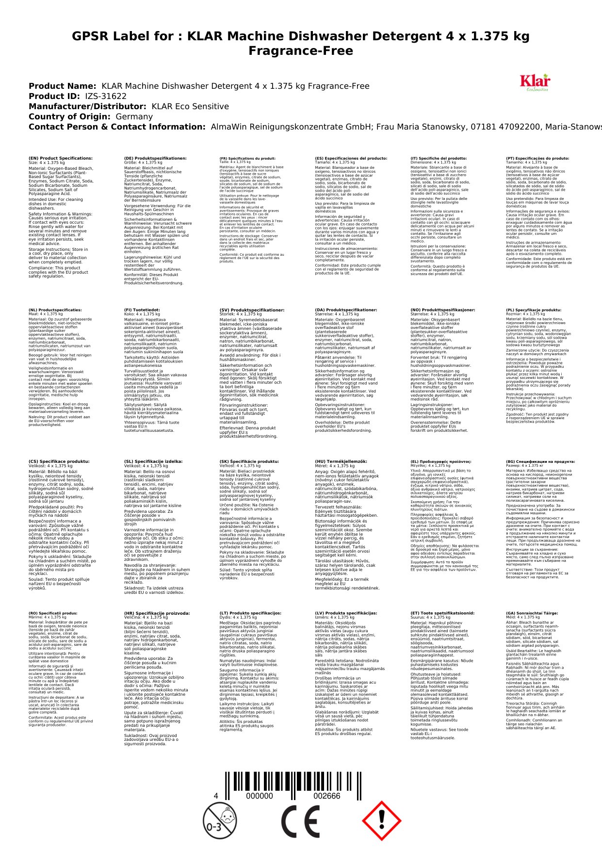 Sodium Citrate, Sodium Carbonate, Sodium Carbonate Peroxide, Sodium Bicarbonate, Sodium Silicate, Sodium Polyaspartat, Tetrasodium Iminodisuccinat, Capryl Glucoside, Disodium Disilicate, Protease, Amylase.