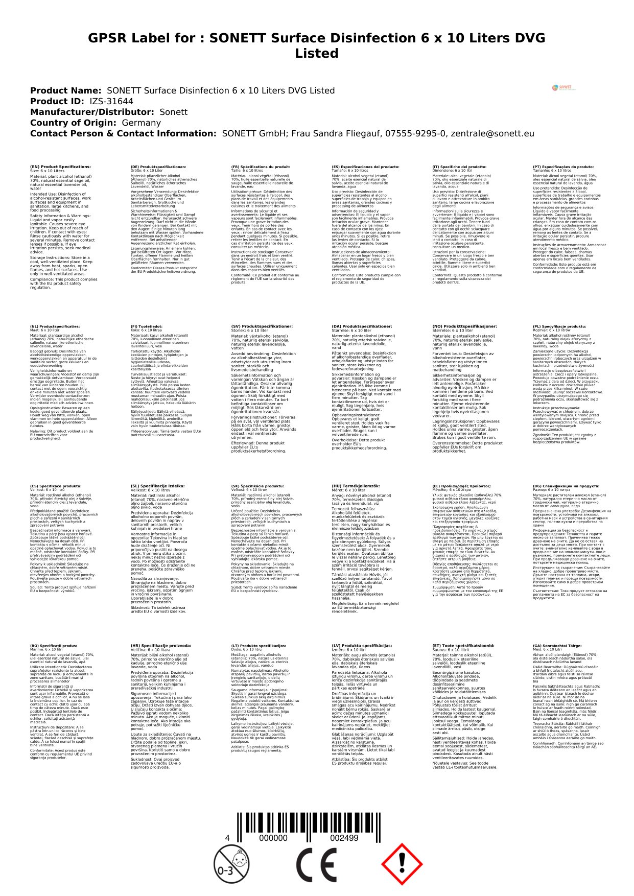 SONETT Flächendesinfektion 6 x 10 Liter DVG gelistet